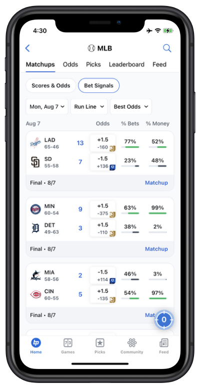 Easily see how others are betting with Bet Signals. Compare the % of bets and the % of money to know where the crowd is betting, and where the sharps have their money.