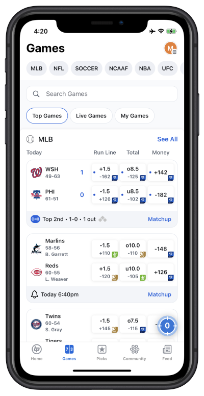 In the Games tab, you can sort by the top matchups, games that are currently live, and those that you have wagers on.