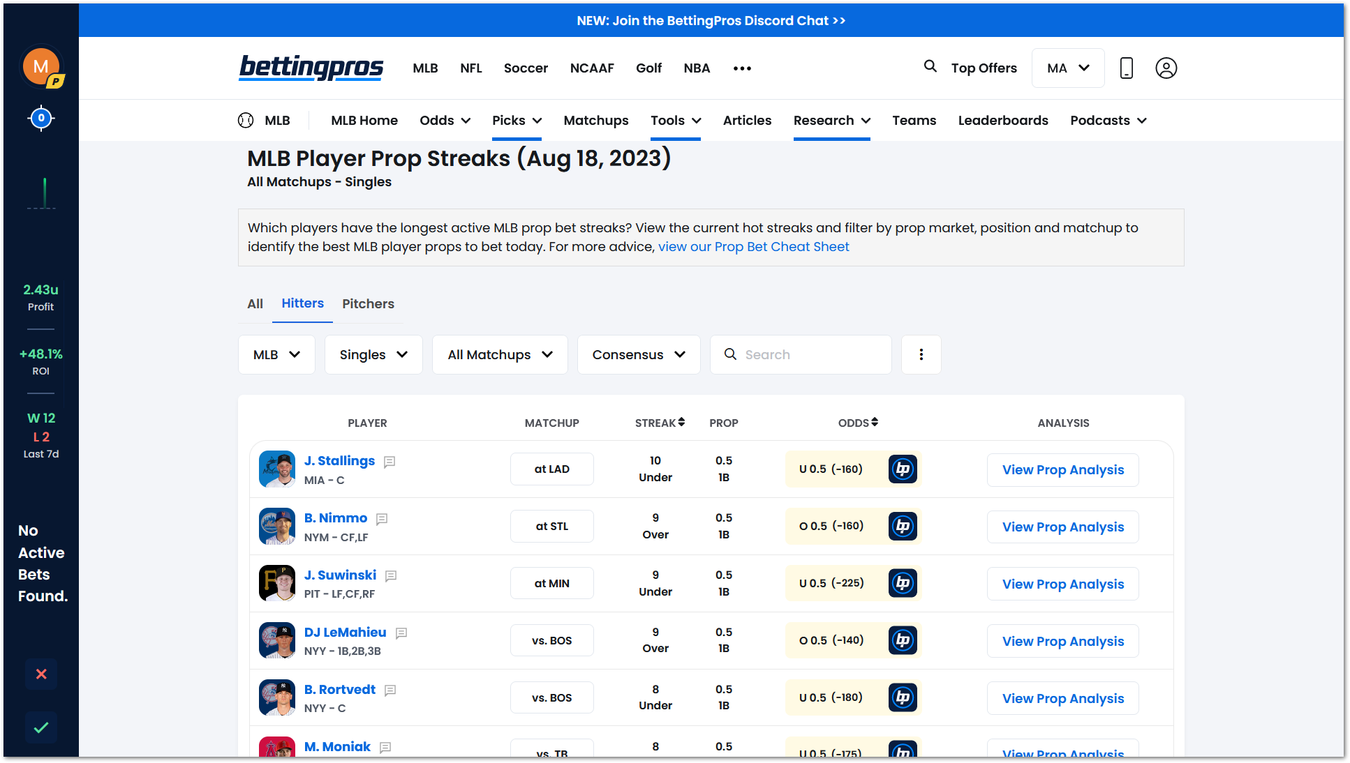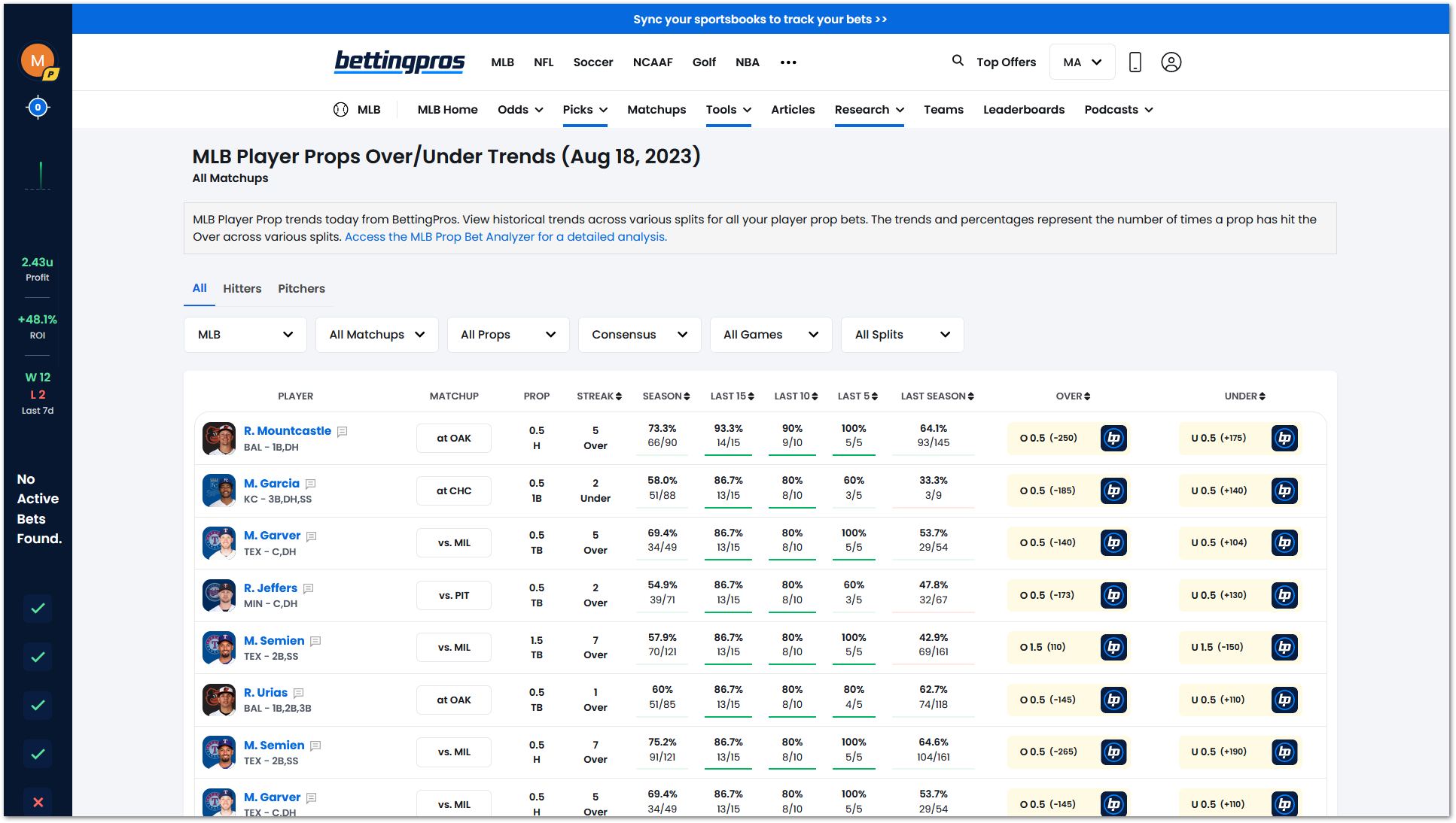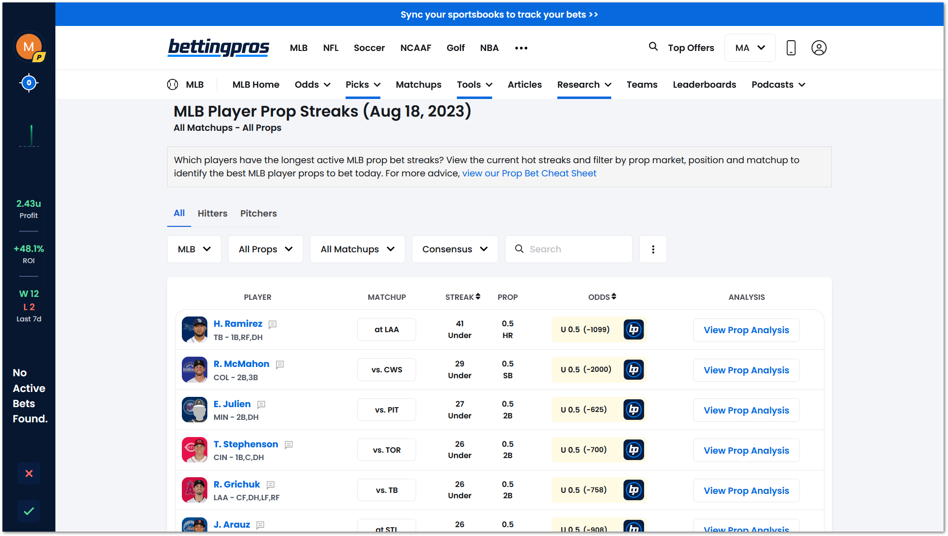 The Prop Streaks report will serve as a great jumping-off point to quickly identify favorable opportunities for you to make winning prop bets.
