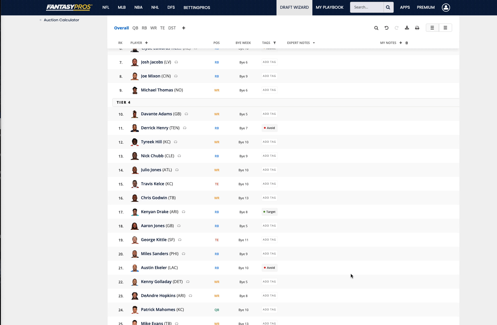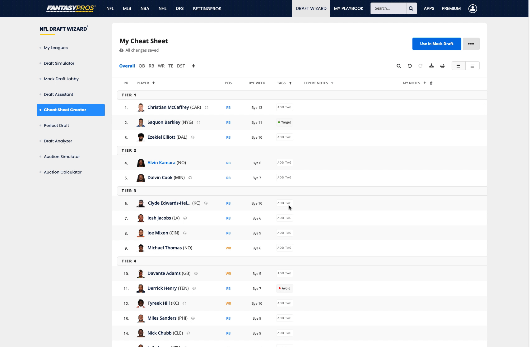 A simple way to highlight key players within your cheat sheet is by using the Tags feature. By assigning a tag to a player, you can label a player to a characteristic, such as our default tags: Target, Sleepers, and Avoid. Each tag has its own unique color so it is easily distinguishable when you look at it during your draft.