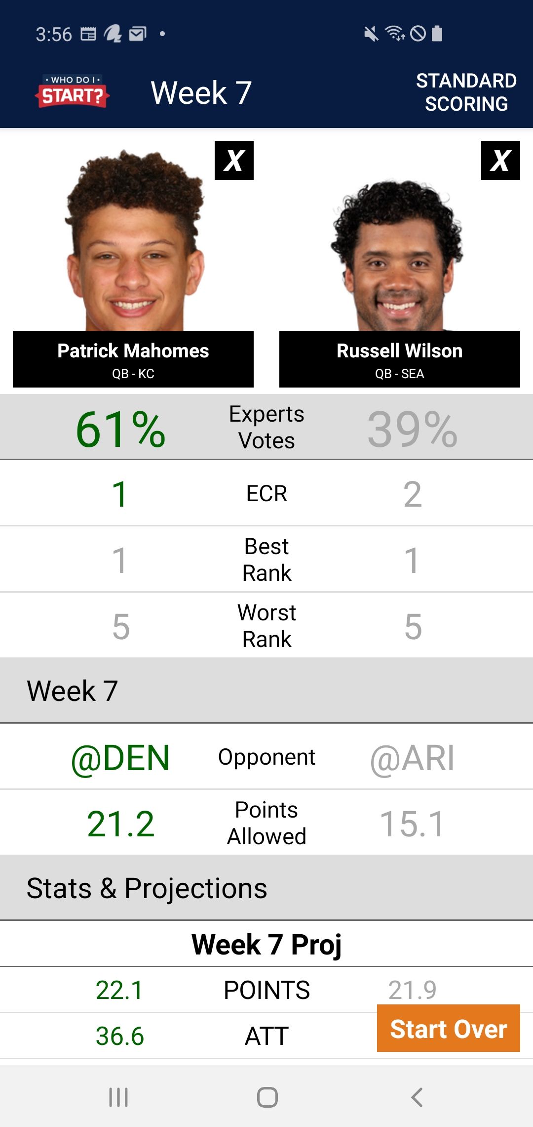 Who Do I Start? for Android is a minimalist player comparison app that displays players by position, ranked by ECR for the current week. Rankings are available to be viewed for Standard, .5 PPR, and PPR scoring.