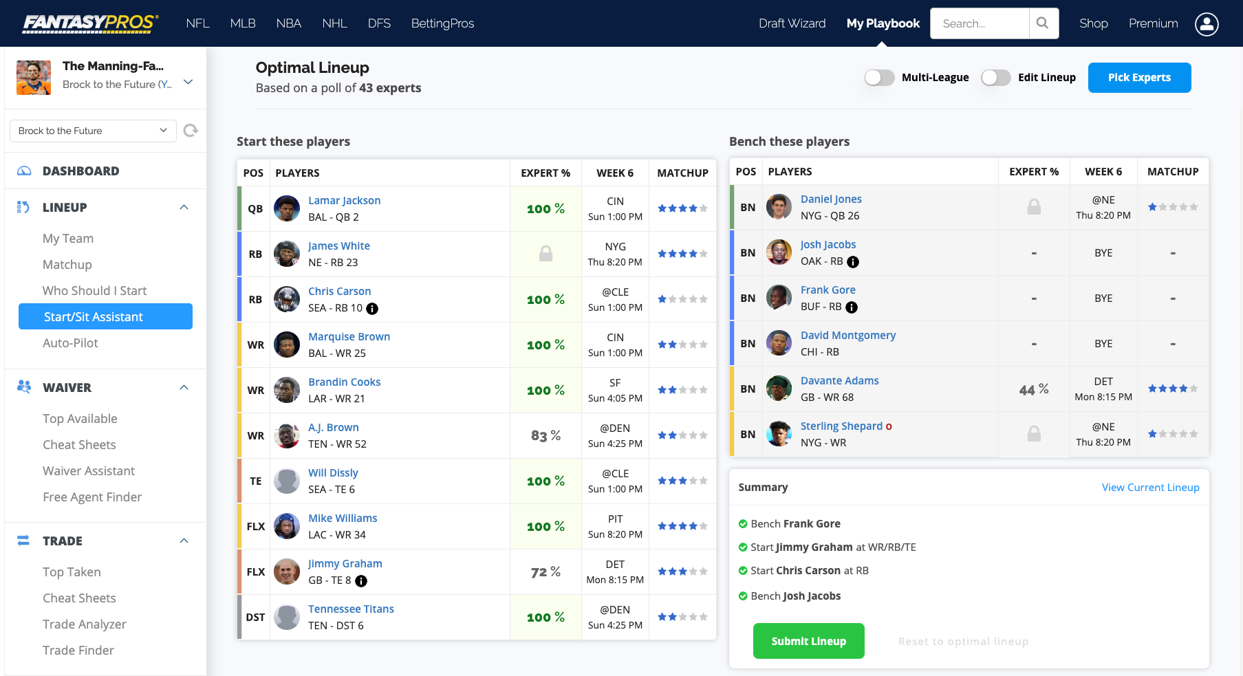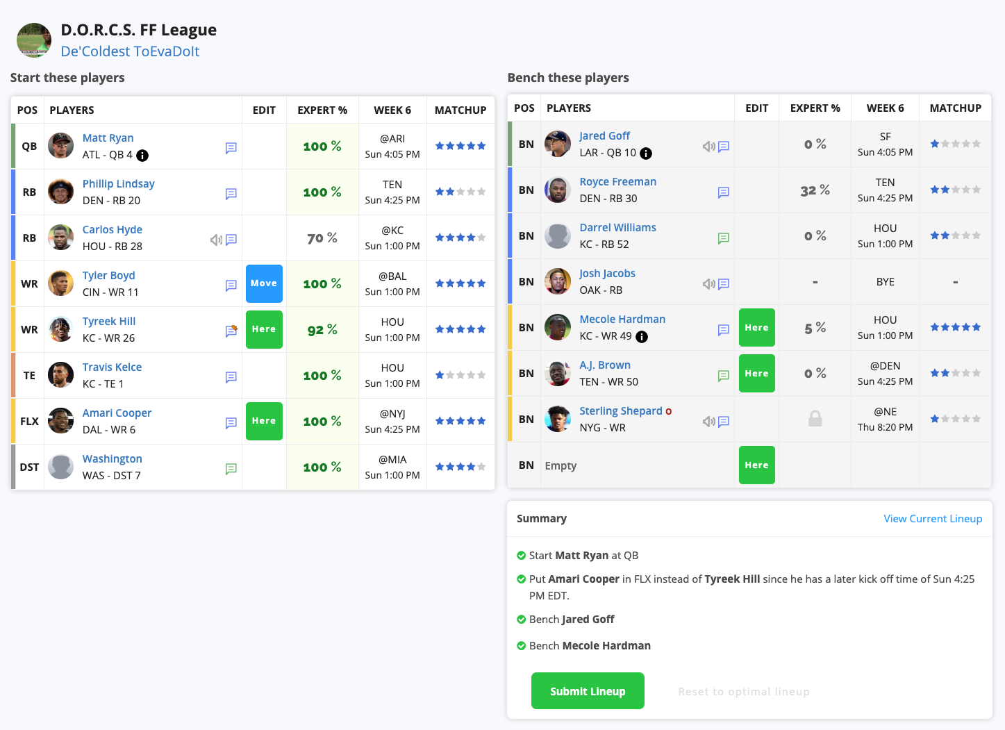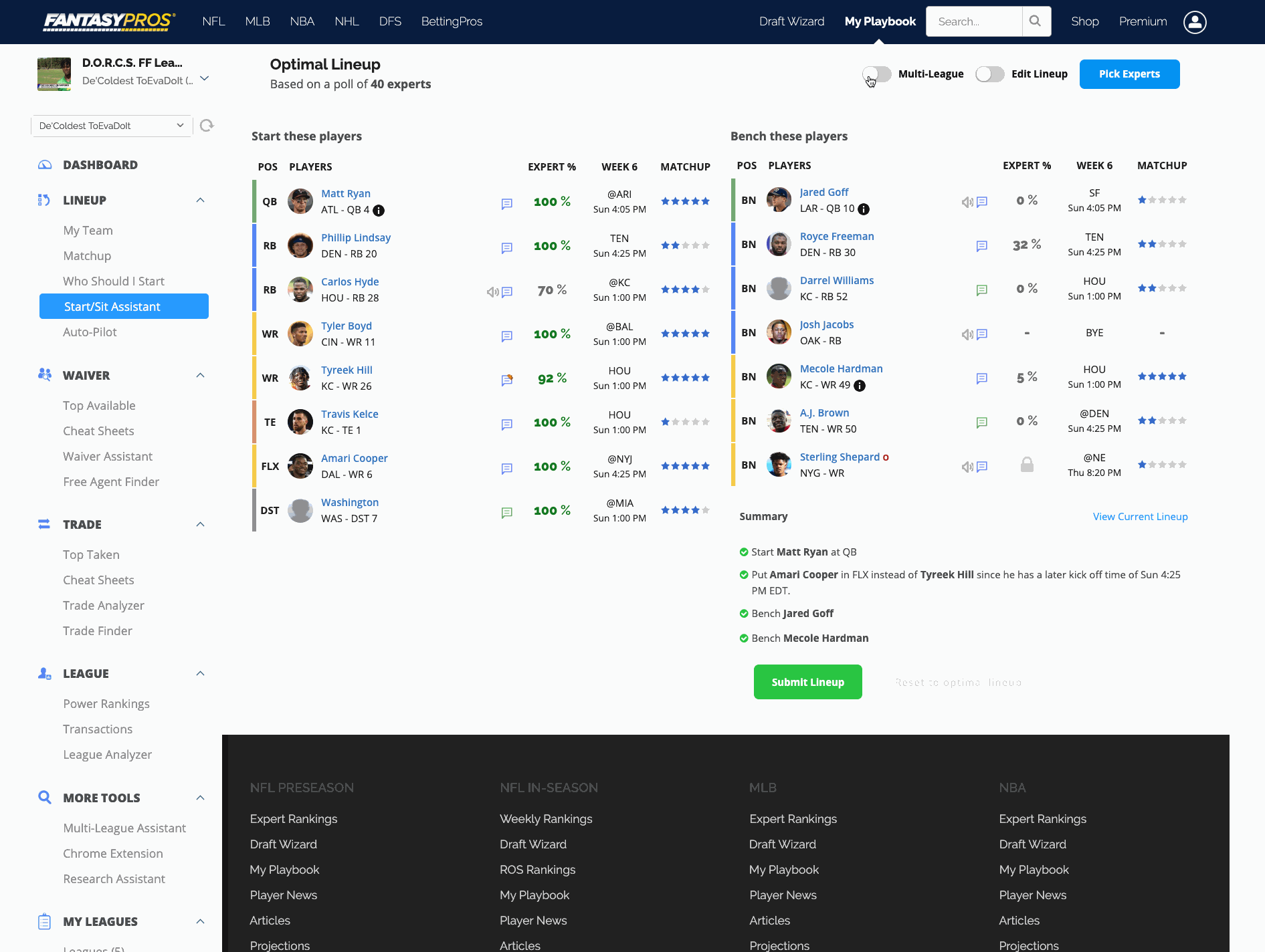 With the ability to start and bench players in your lineups, you can now take into account all of the information FantasyPros has to offer: expert voting % (based on the % of experts that would start a player in your lineup), matchup ratings, and player news via player cards.