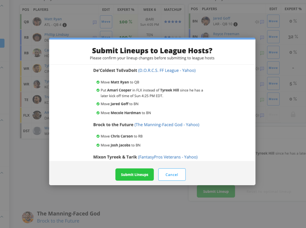 On top of all that, we now offer multi-league mode, where you can view all of your lineup recommendations (or make changes yourself) for all of your synced leagues, all in one screen. You can then submit those lineups to their respective league hosts, all with a couple clicks.
