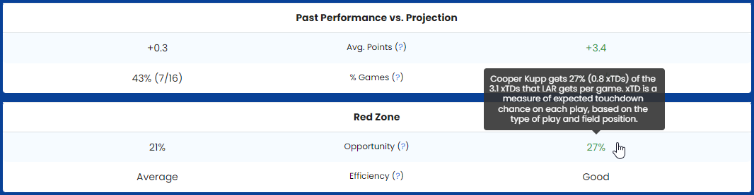 Premium subscribers P will also be shown advanced metrics for all comparisons, including past performance vs. projection and red zone usage.