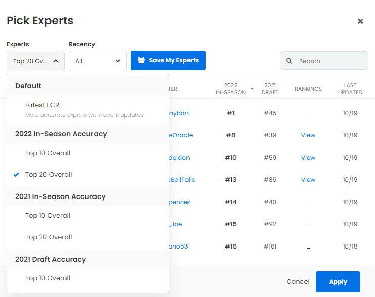 For a more detailed look, break out the expert voting in a number of ways to help you feel more confident in your choice. You can use the Pick Experts filter to focus on the experts you'd trust the most. Manually select experts, or choose from one of the premade sets.