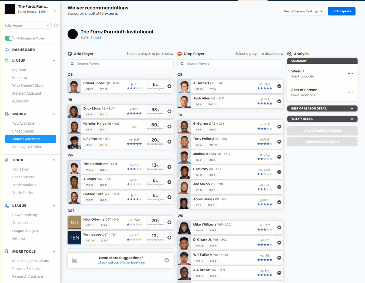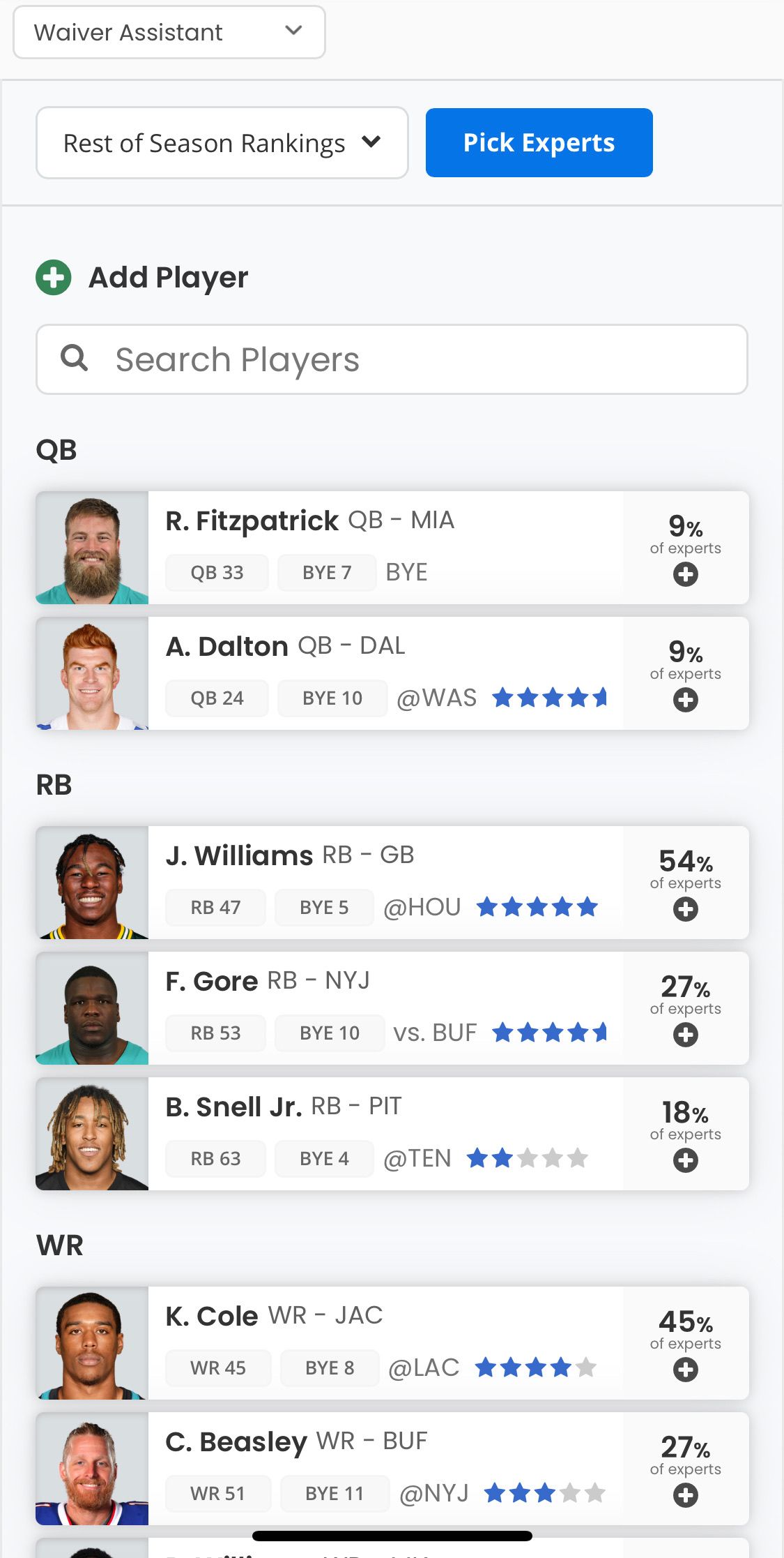 - For the waiver recommendations, the percentage of experts that would add the recommended player to your roster.