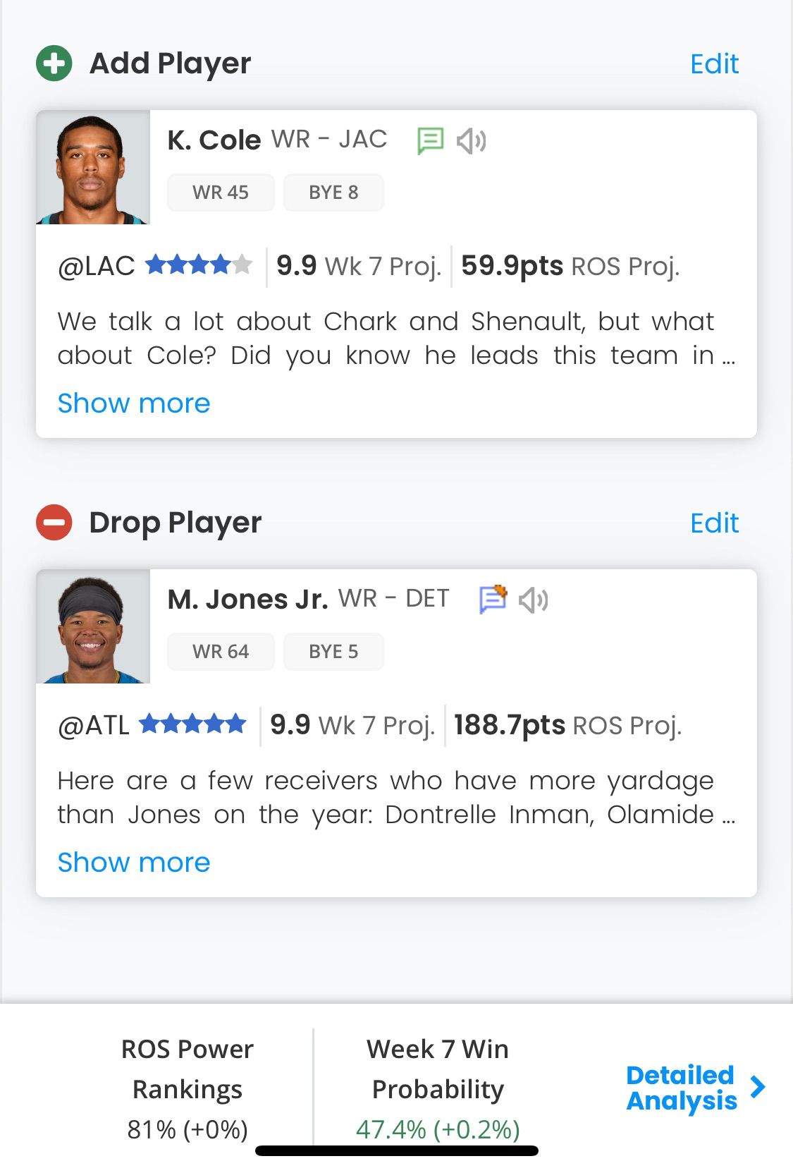 In both the Add and Drop Player columns, we've revamped the way players are displayed with a new card layout which shows: