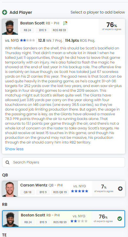 When selecting a player to add, we've included a new module that outlines the player's weekly and rest-of-season projections, as well as a player note from Tags' weekly Primer article that describes their outlook for the week.
