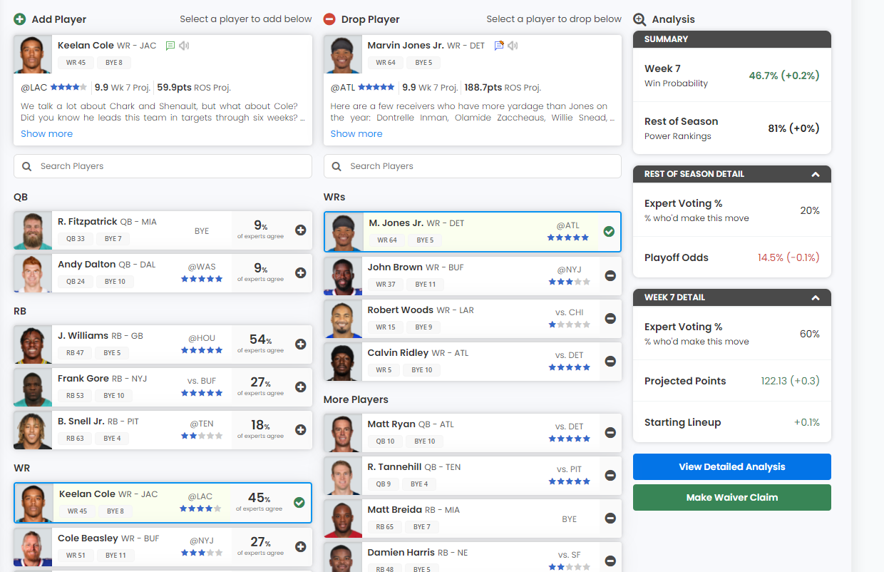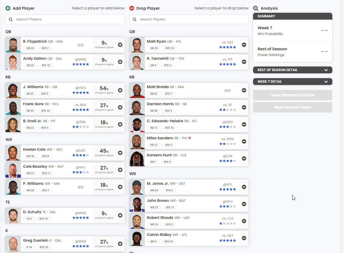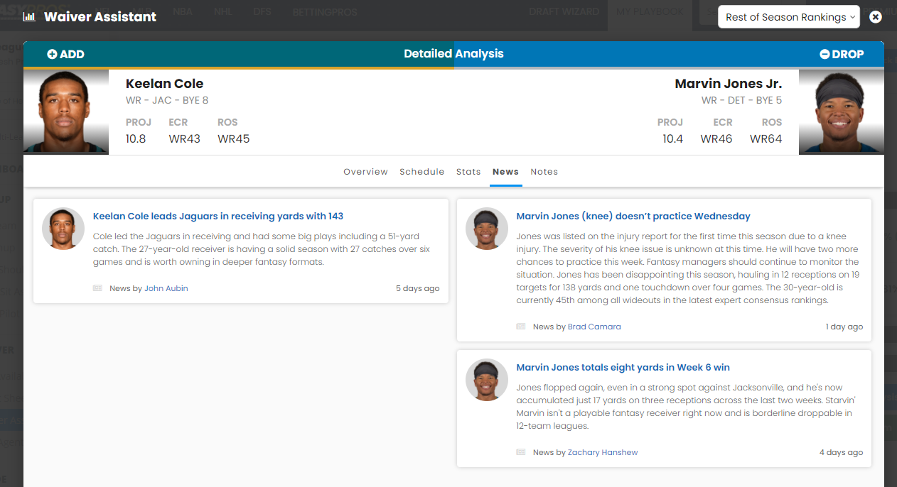 There are three new sections in our Detailed Analysis: Stats, News, and Notes. These sections will help you compare the players in the transaction and provide more up-to-date information before submitting your waiver claims.