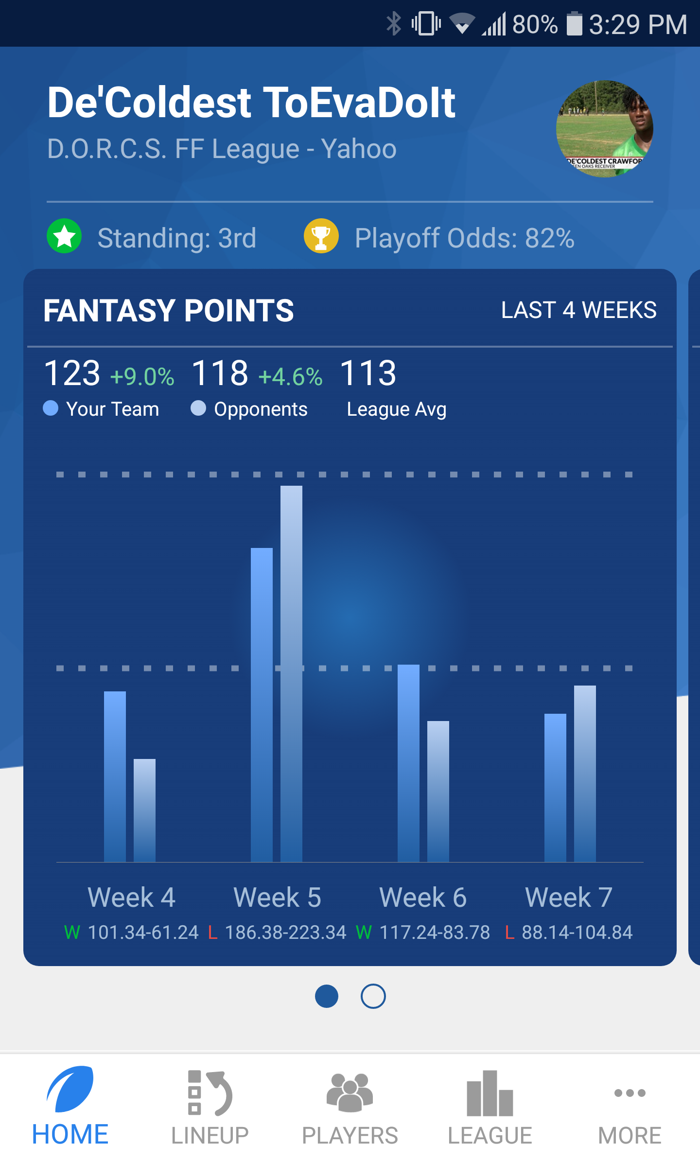 You can also see how your team is doing relative to the average fantasy points put up by the rest of your league, and if your opponents are doing better/worse than average (we all know you're in last place because all the other teams are dropping massive points on you when you play them, right?)