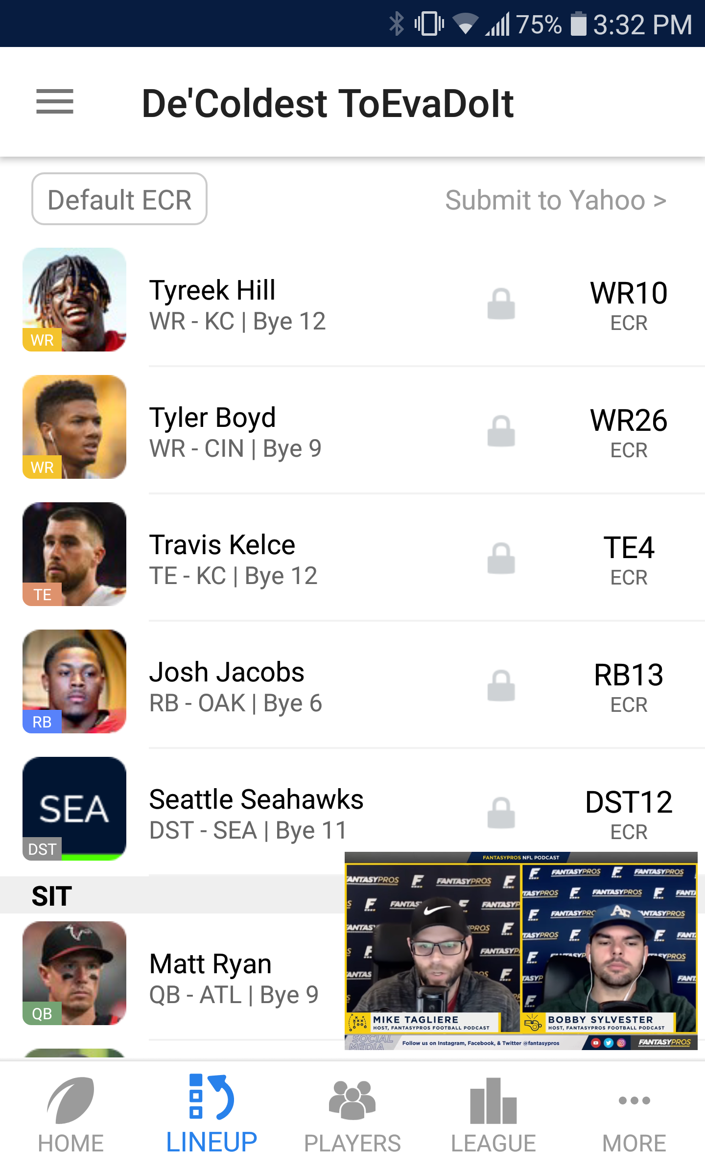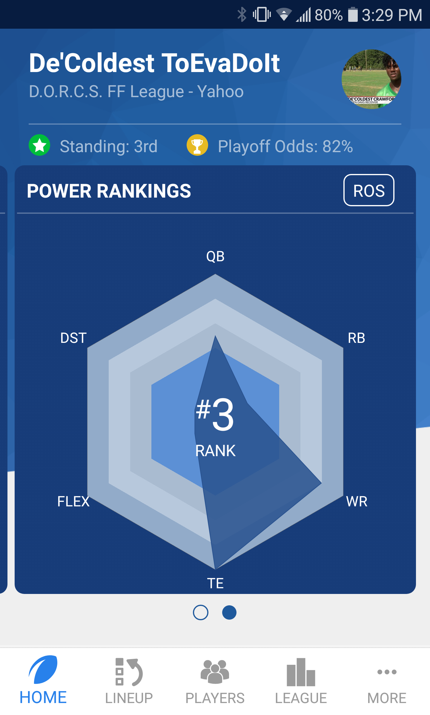 You can also see how your team stacks up positionally for the next week or for the rest of the season. As you can see here, my Kelce + Tyreek stack is helping me out... RBs? Yeah, gambled and lost there.