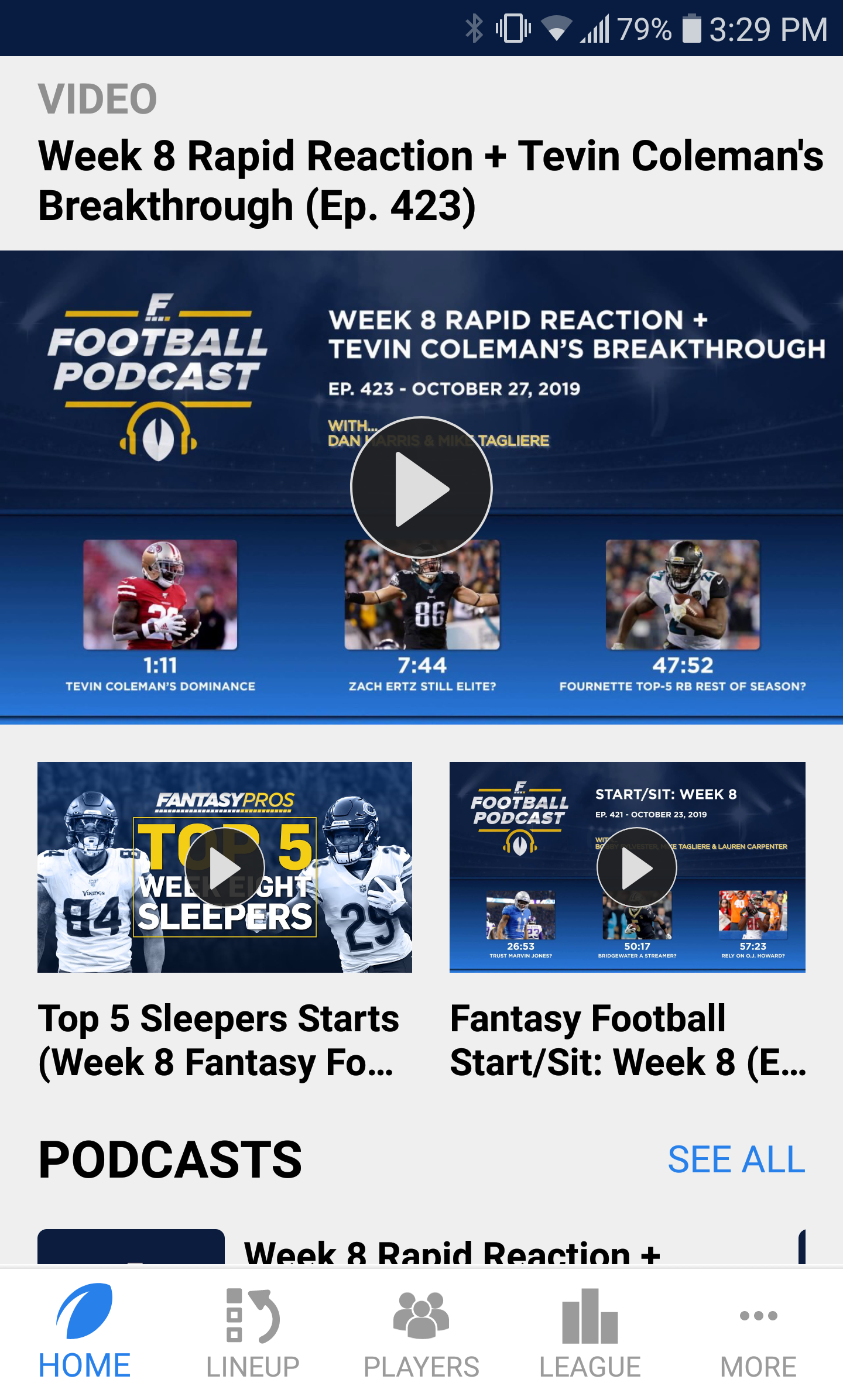 At the bottom of the home screen is an updated videos section (also available in the news feed area). Playing any one of our videos here will allow you to minimize it so you can watch/listen while reading player news, setting your optimal lineup, analyzing waiver adds, and more.