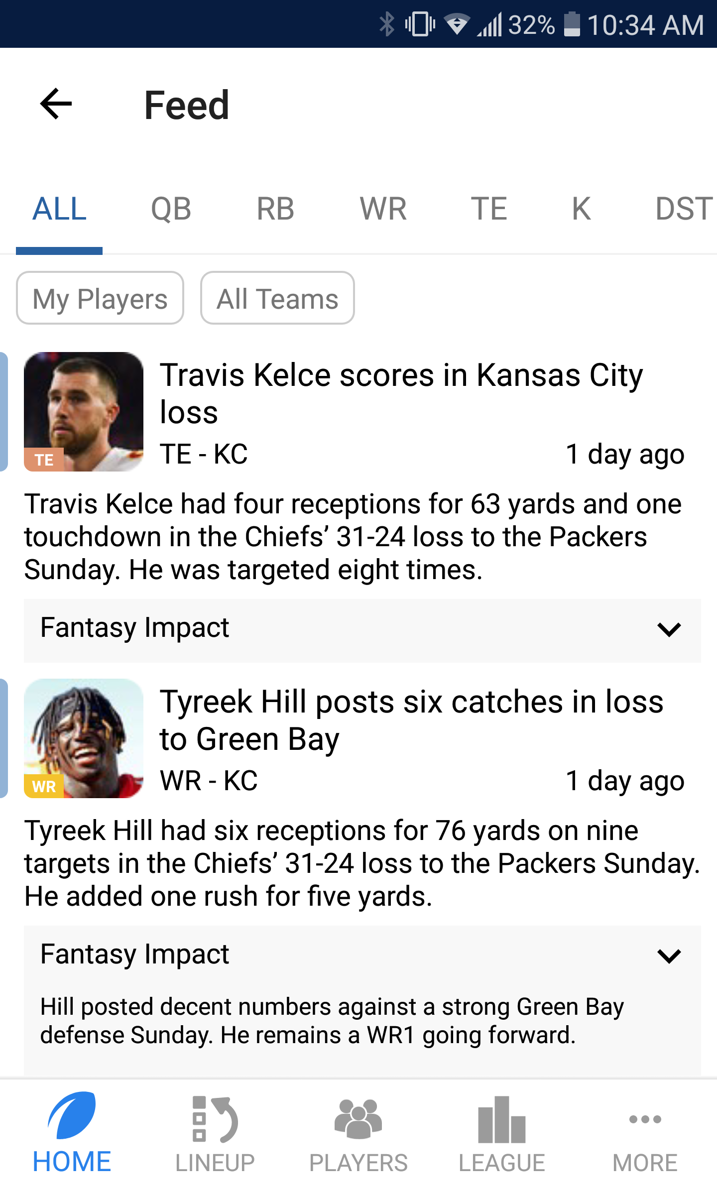 With the new and improved news feed, you can filter out only news for your team (or all players, or only available players), along with positional selections (e.g. only show news for available RBs, great for making waiver decisions).