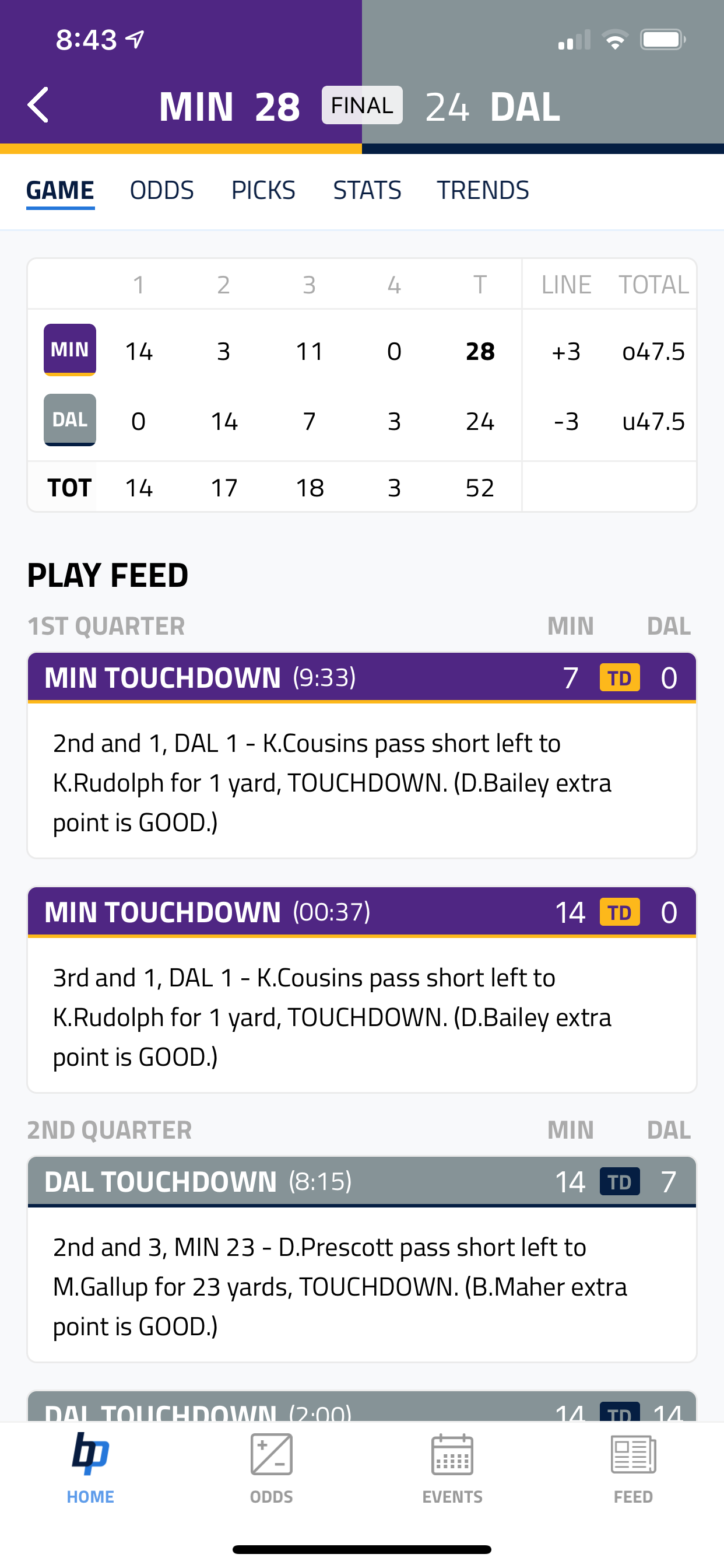 With the latest update to our BettingPros app for iOS and Android, you can now keep track of NFL scoring events in real time and see how it's tracking against the spread, point totals, and money lines.