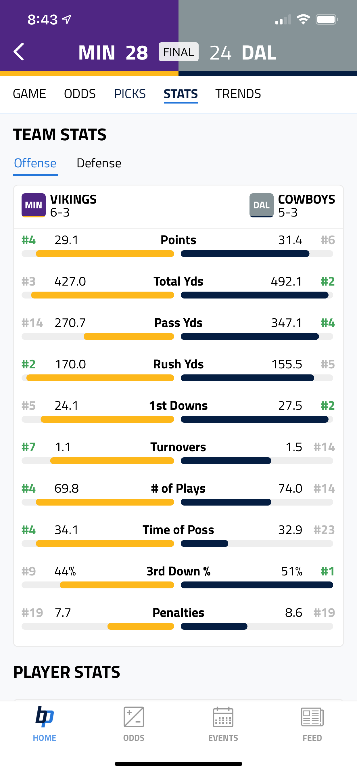 Additionally, NFL matchup screens have been updated to include more information to help you make your betting decisions, including individual team stats (league ranking for points scored, TDs, etc.) and trends (how the teams are doing this season and head to head against each other)