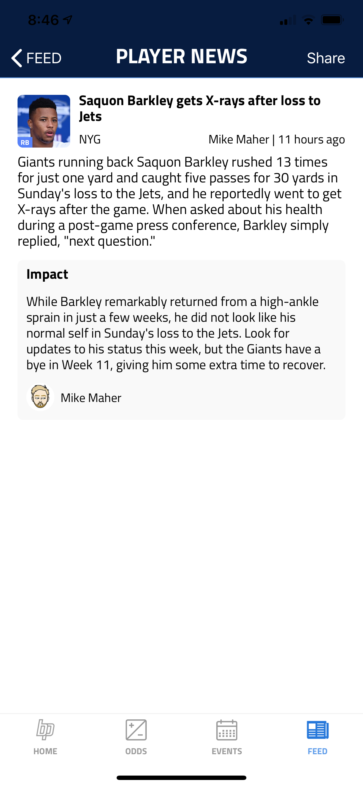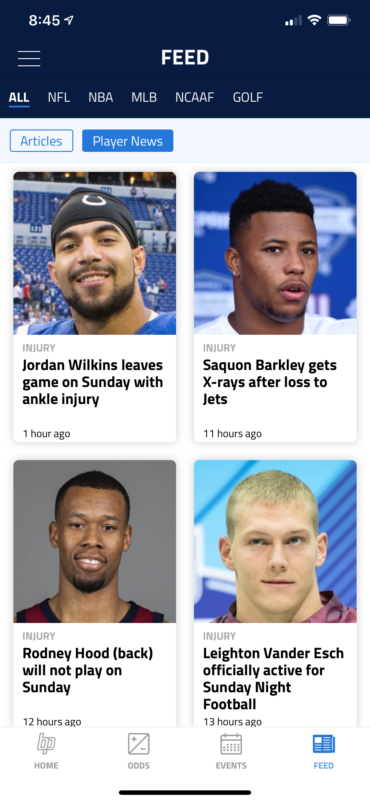 You can now see all game relevant player news across all sports (NFL, NBA, MLB, NCAAF, and Golf) to help you make those wager decisions as games are set to start. This is incredibly useful if a significant playmaker is affected but betting lines haven't moved yet.