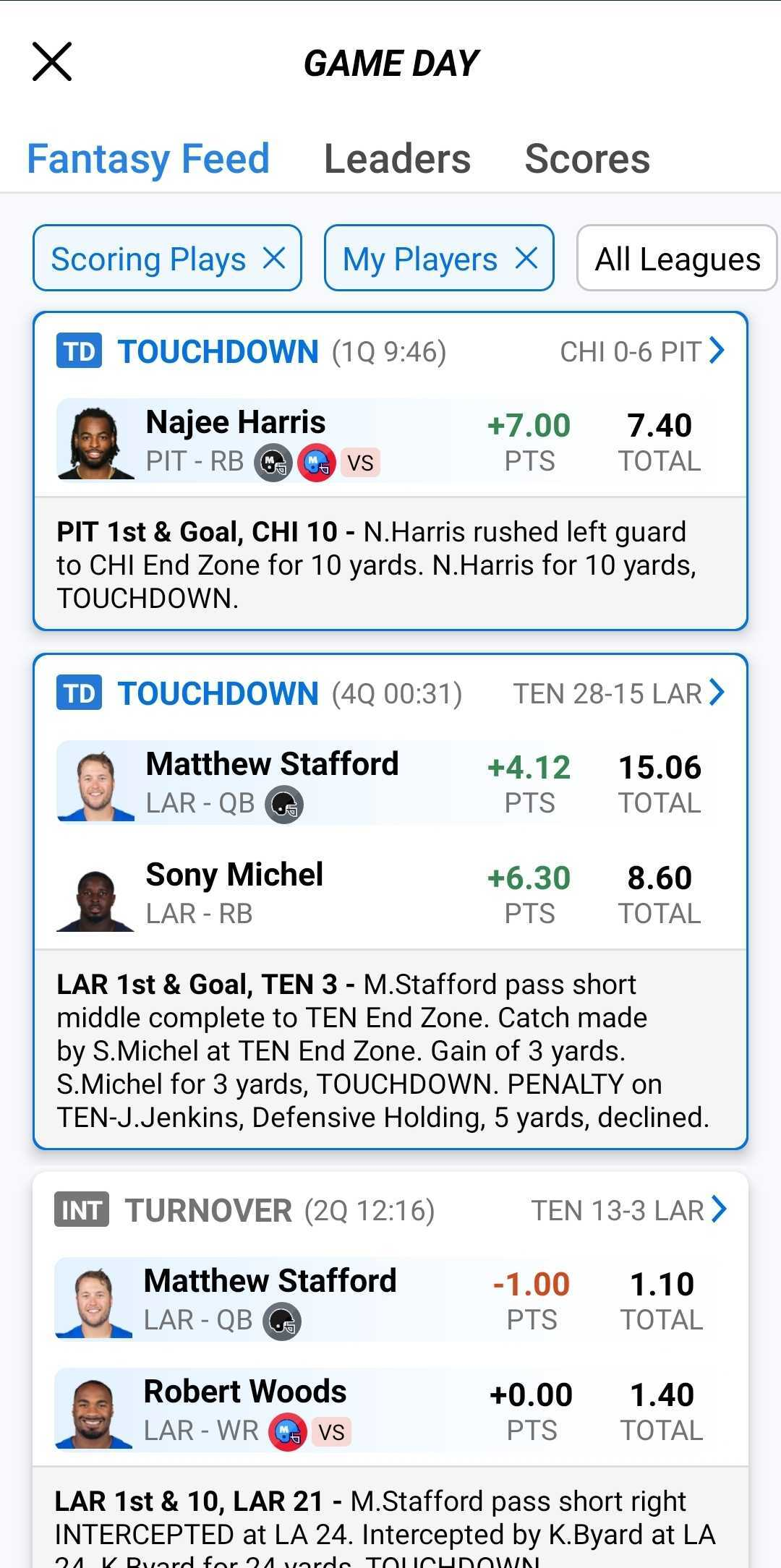 Tapping on any of the games will show you scoring breakdown, player stats, game plays, and the fantasy feed, which breaks down every fantasy relevant play in the game as it happens live.