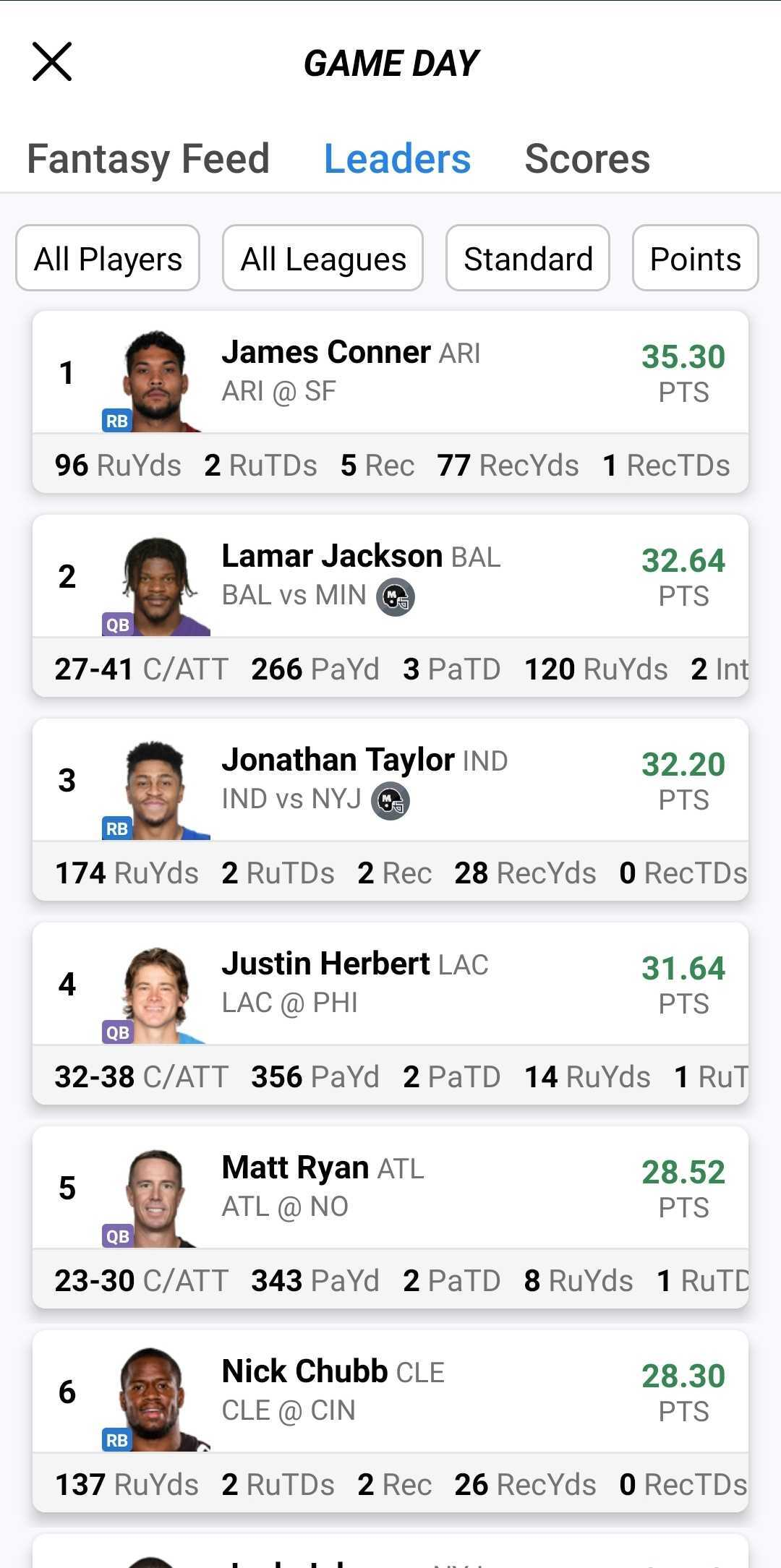 Game Day, also available on the web and in our My Playbook mobile app, is now accessible in the Fantasy News & Scores app. You can view live game statistics and fantasy leaders all with a few taps.