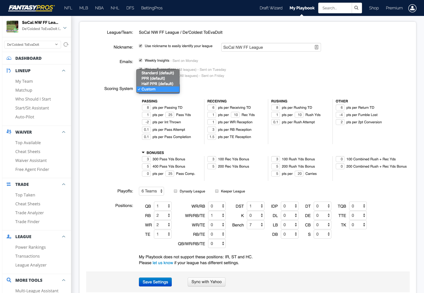 It's important to note that even with this launch, custom scoring is not automatically enabled. You must enable this yourself. To enable custom scoring settings, go to your league settings screen (accessible via the "Settings" link under "League" in My Playbook or via the My Leagues screen). Next, select "Custom" in the "Scoring System" dropdown.