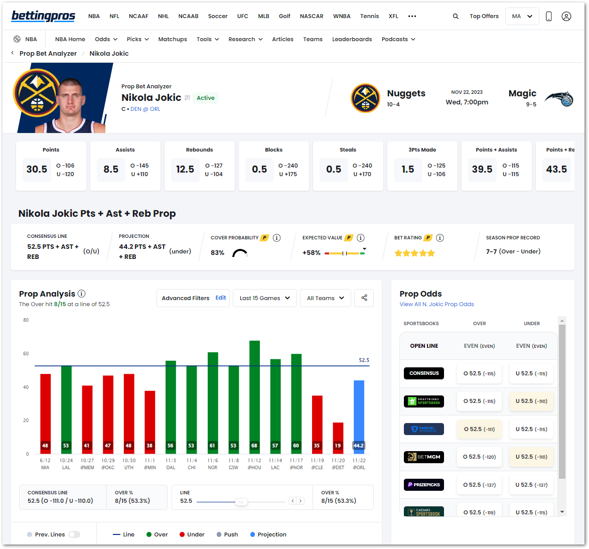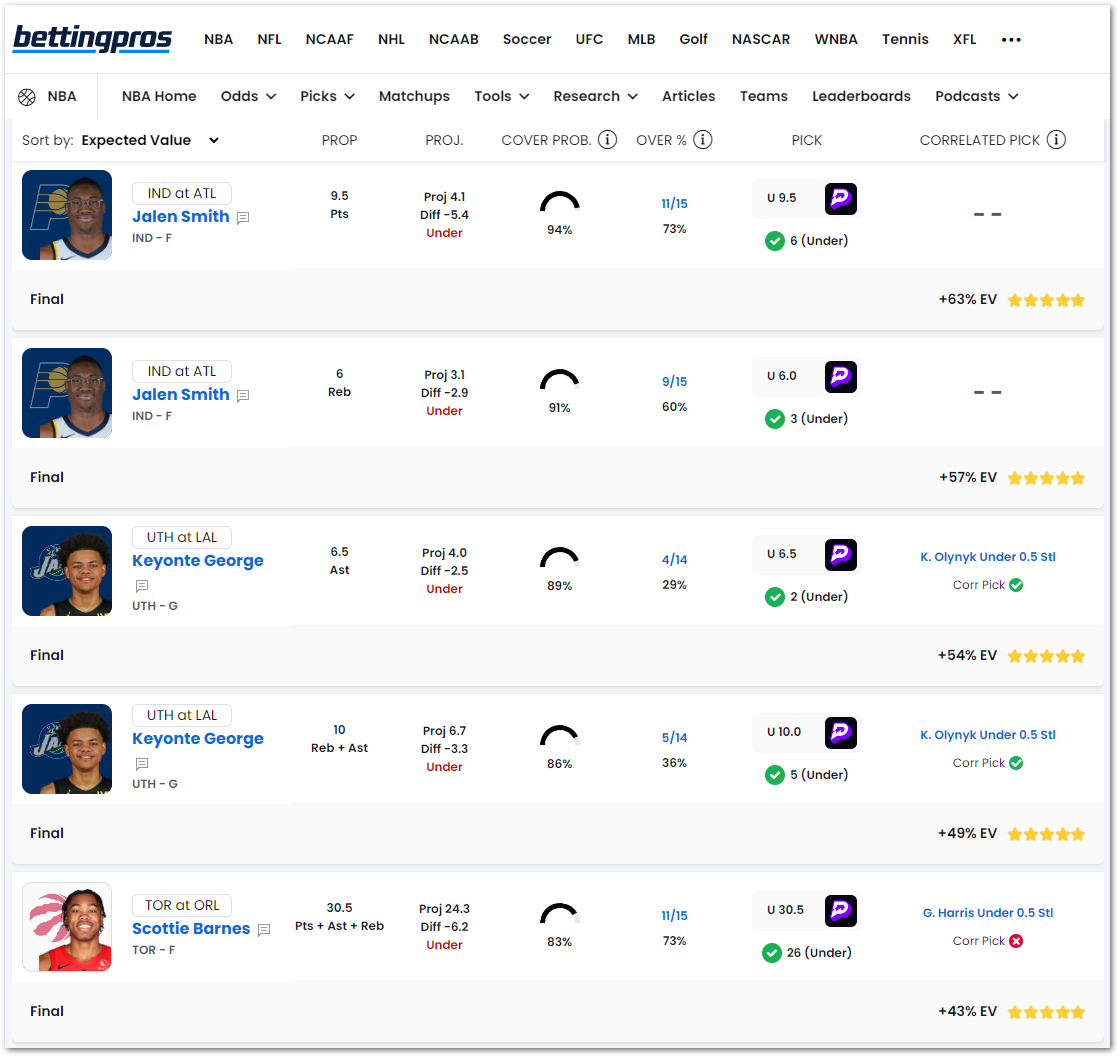 Discover the top picks across the NBA. Supported props include all major stat lines across the NBA, as well as the Fantasy Points Over/Under prop.