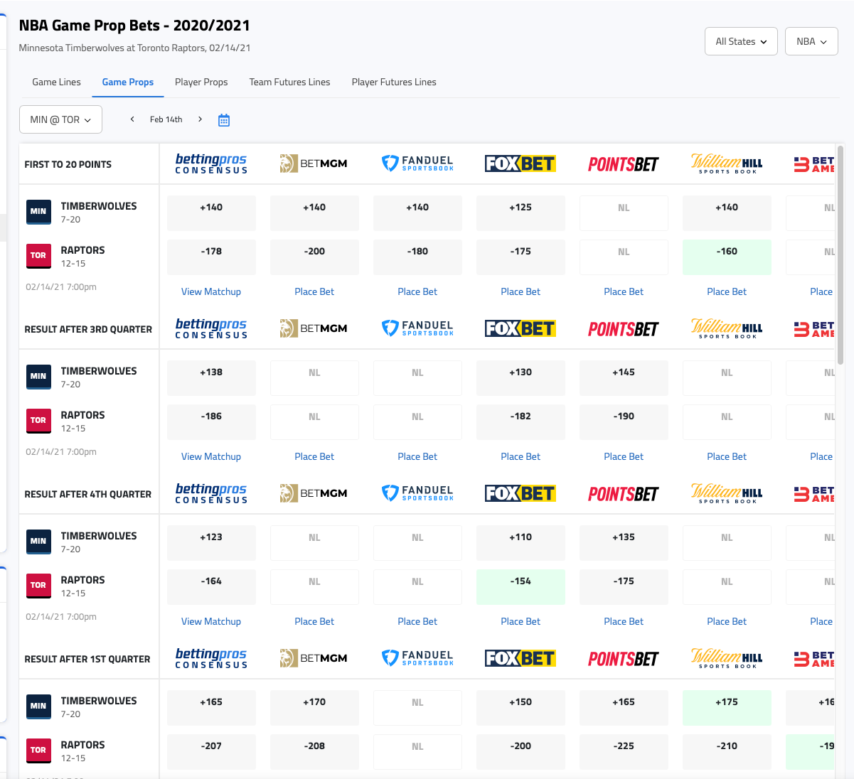 On our new NBA game prop bet pages, we list all the most popular game prop bets for each scheduled game, including first to X points, team to score first, and result after each quarter. You can see the live odds for each sportsbook, and the green highlighted lines indicate the best bet opportunity among the listed sportsbooks.