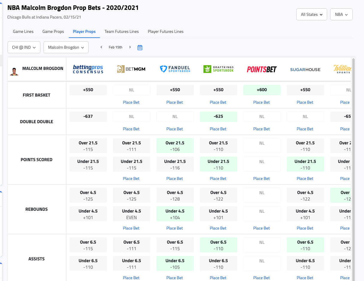 The same features are available on our player prop bet pages, where you can see a list of all the prop bets for each player for the selected game/day, and the odds for each prop for all the sportsbooks. We display the most popular player prop types such as individual stat categories (points, rebounds, assists, etc.), double-double, and first basket.
