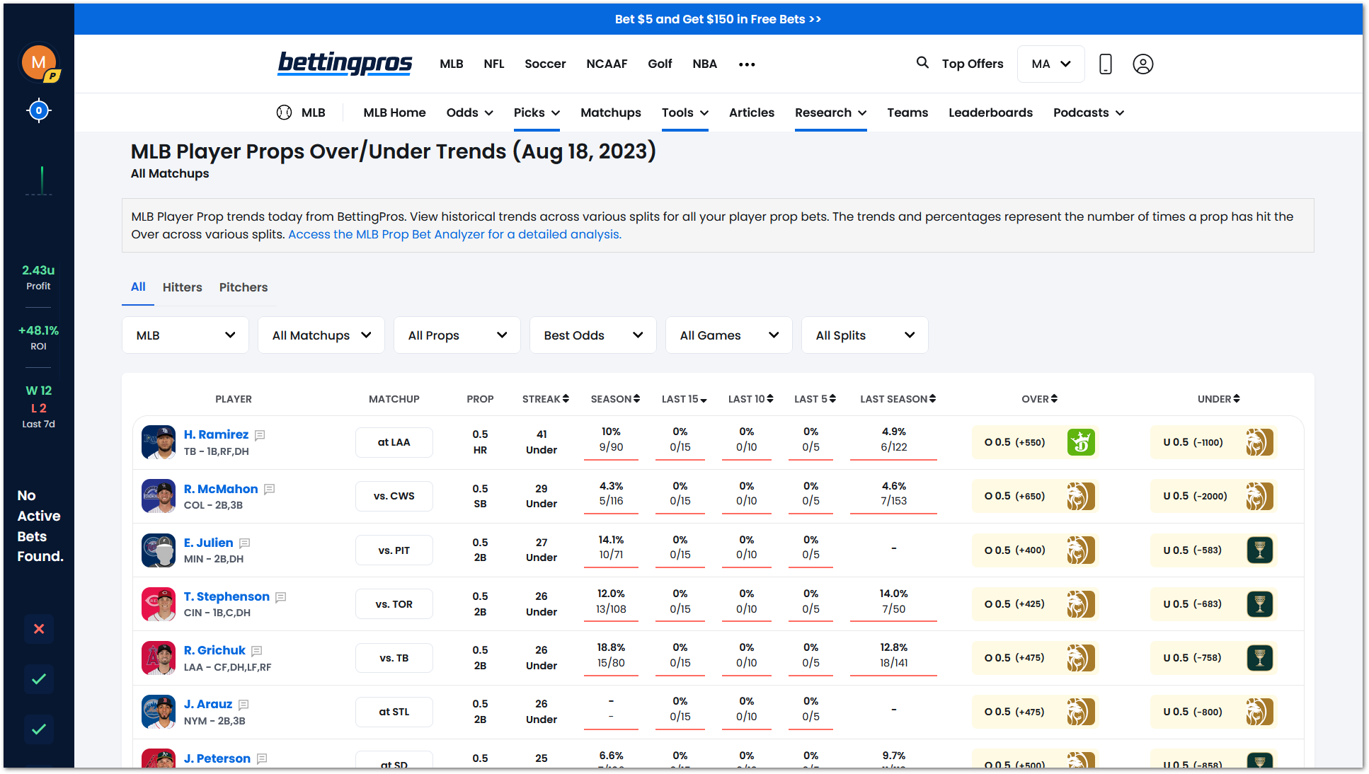 MLB Player Props Over/Under Trends Report | MLB Player Prop Streaks Report