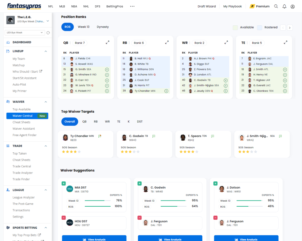 With Waiver Central, take the guesswork out of how to improve your fantasy team. Get instant positional power rankings for your team, top waiver targets, and waiver suggestions that will make the biggest impact on your team.