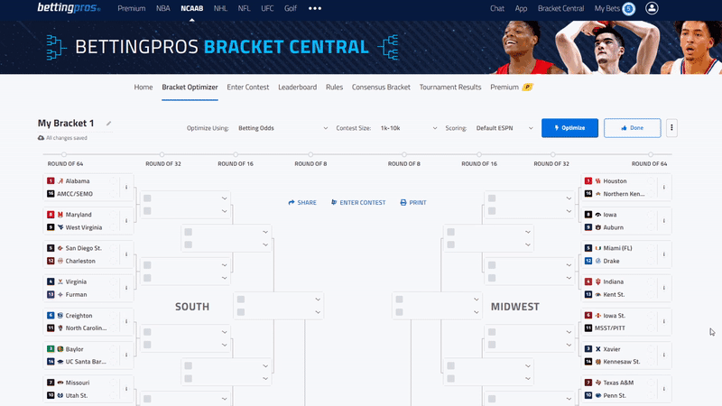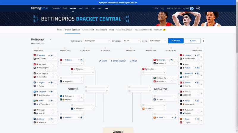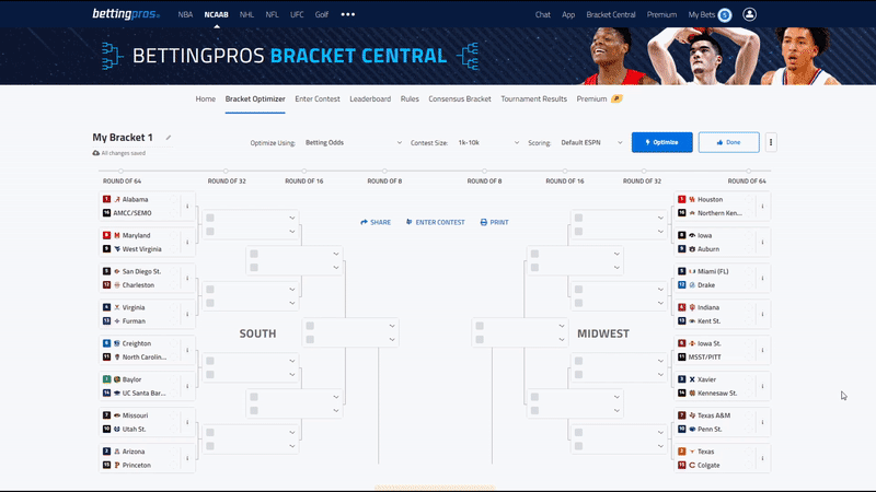 Bracket Central, including the Bracket Optimizer and the Bracket Contest, are available on BettingPros.com and on our mobile apps, now!