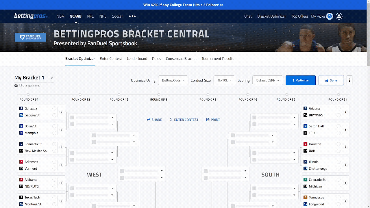 After you're done creating your winning bracket, enter into the FREE BettingPros Bracket Contest for your chance at bragging rights and a chance to win some great prizes, including signed basketball memorabilia and DFS credits to FanDuel. For full information on prizes as well as terms and conditions, check out the BettingPros Bracket Contest page.