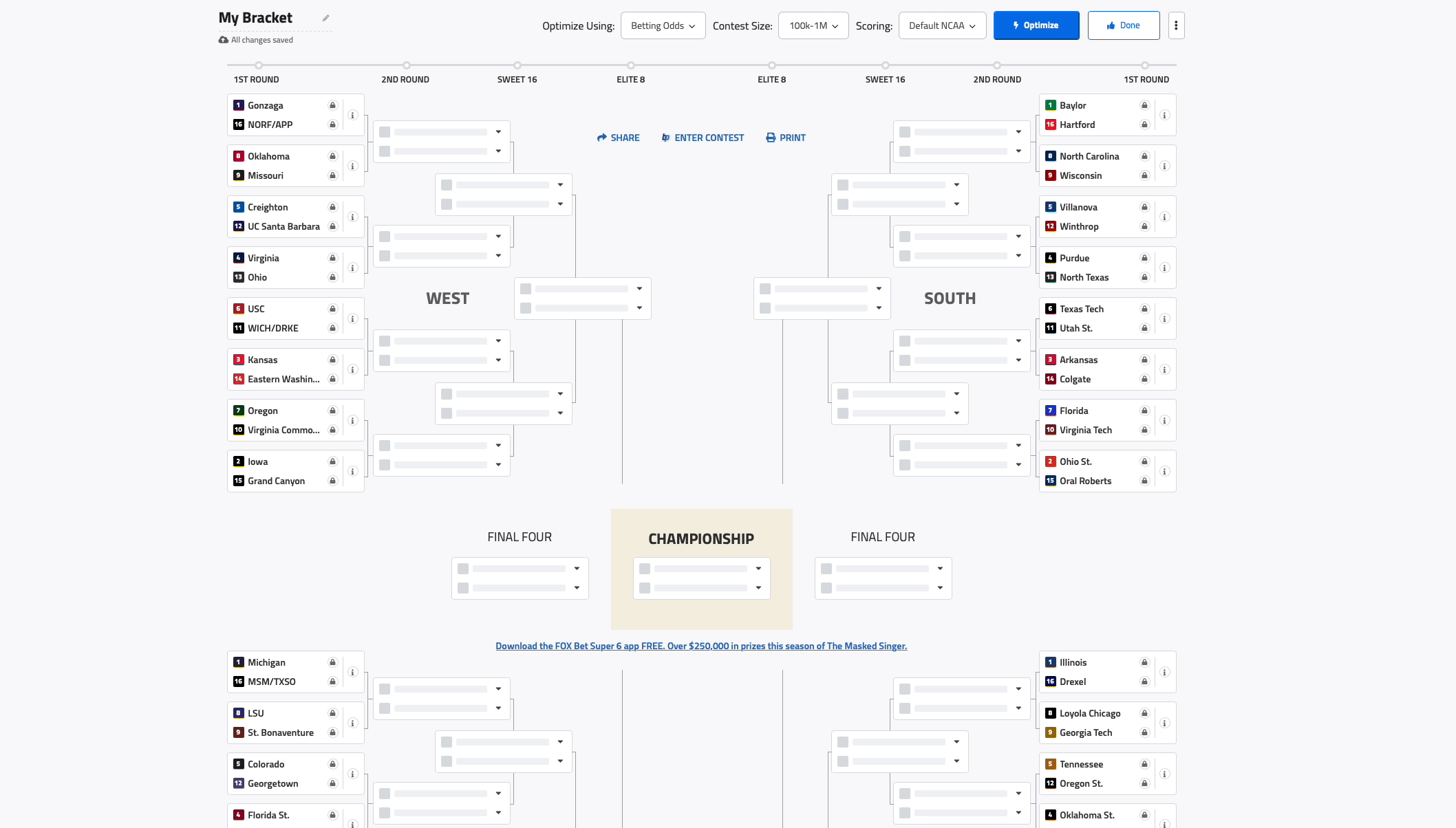Fill out your brackets now with the Bracket Optimizer and join in on the March Madness by entering our free contest and sharing your bracket on social media!