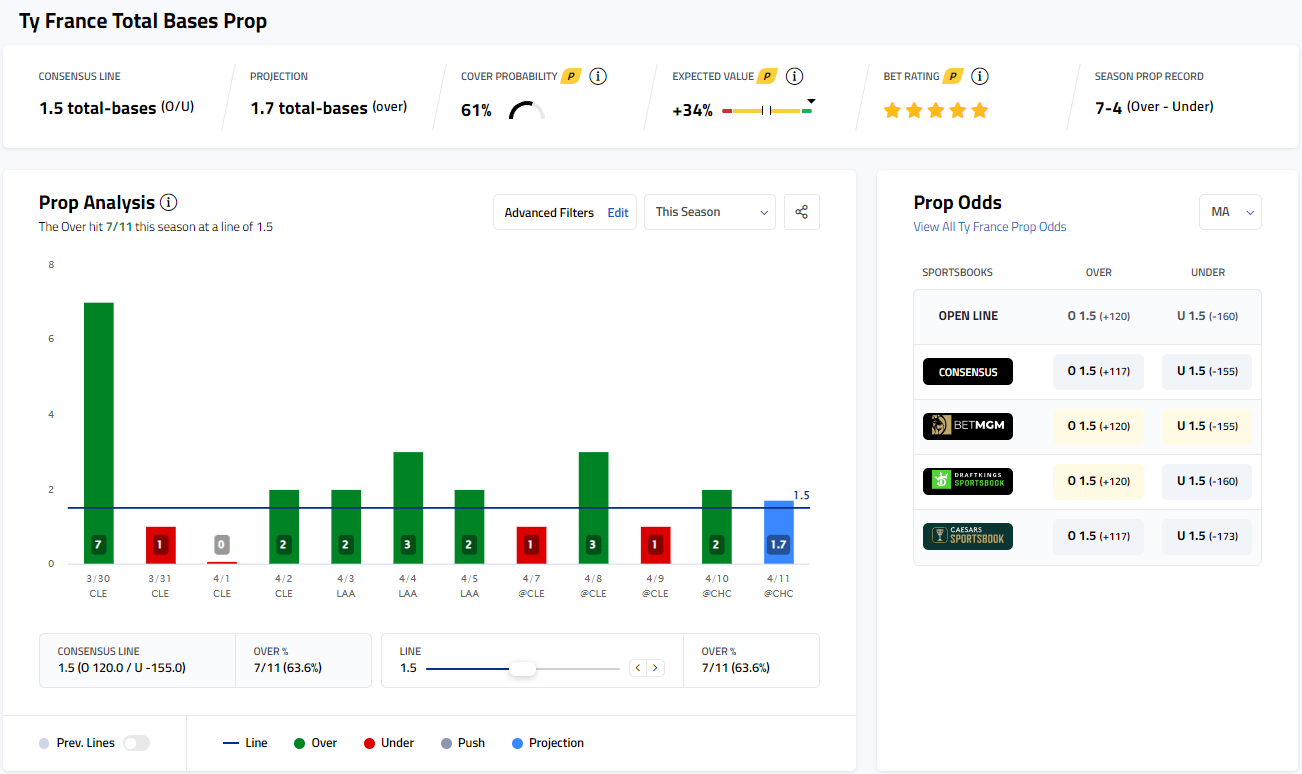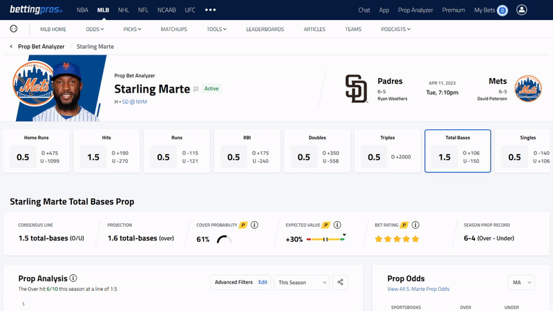 The MLB Prop Bet Analyzer provides up-to-date projections by factoring in the player's recent performance, the opposing pitchers or hitters, game script, and more.
