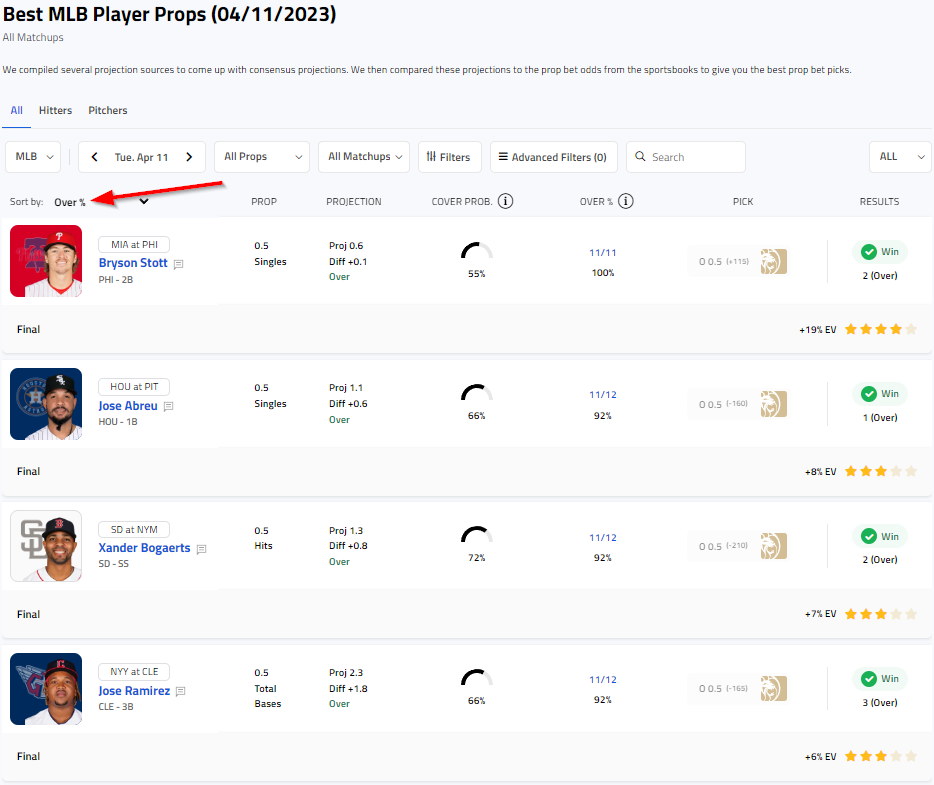 With a recent update, we've also added the Over % (the number of times a prop has gone over at the current line). Sort by Over % to see which players have been on hot streaks.