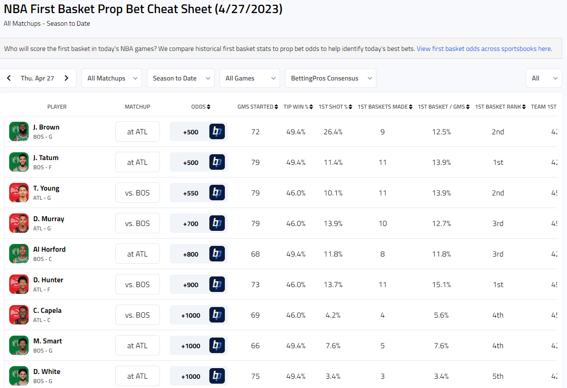 The NBA First Basket Prop Bet Cheat Sheet is a fun way to get involved with the NBA playoffs. See how often each player takes the team's first shot, how often they make the first bucket of the game, and the best odds across each book.