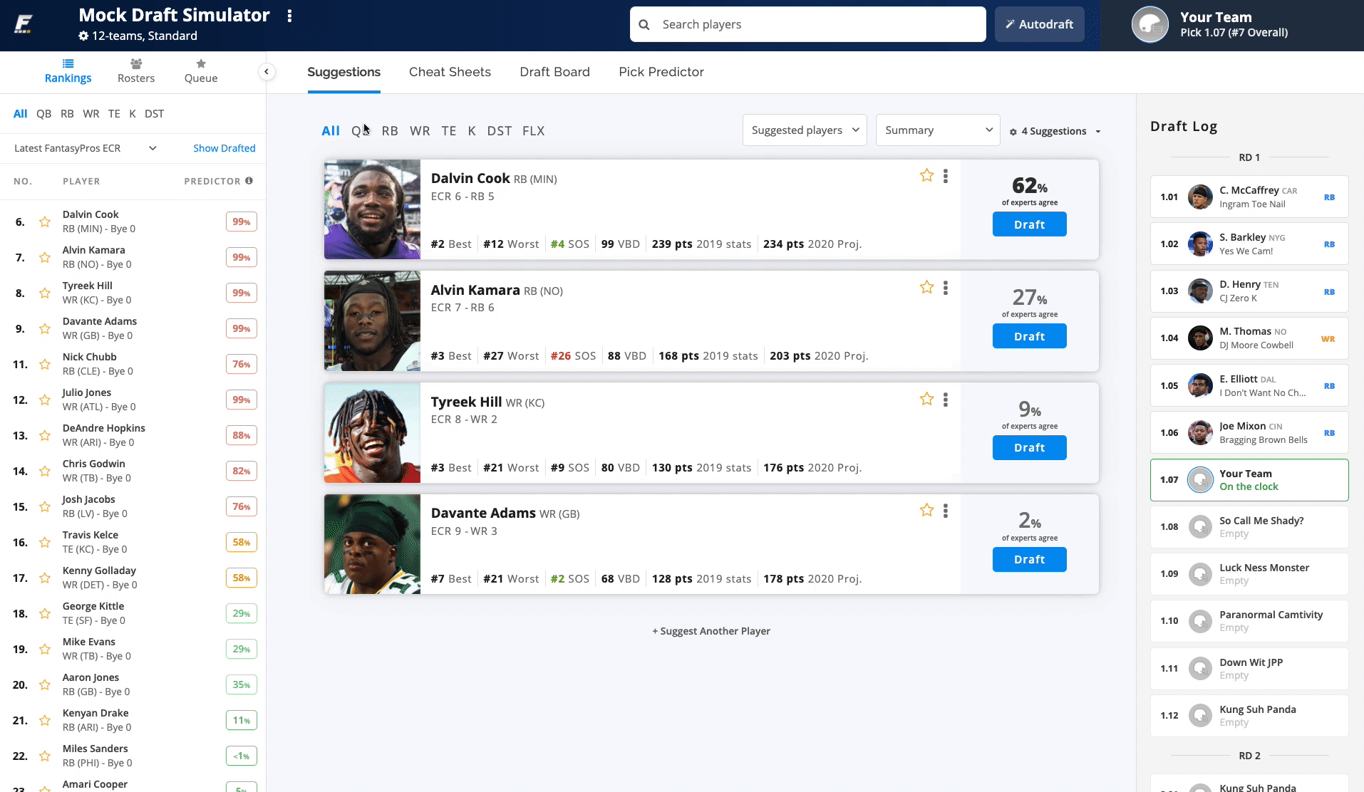 With the move of the Rosters pane to the lefthand side, we are now able to hide the Draft Log when viewing other tabs, such as the Cheat Sheet, Draft Board, and Pick Predictor. The Draft Log will only be displayed in the Suggestions tab.
