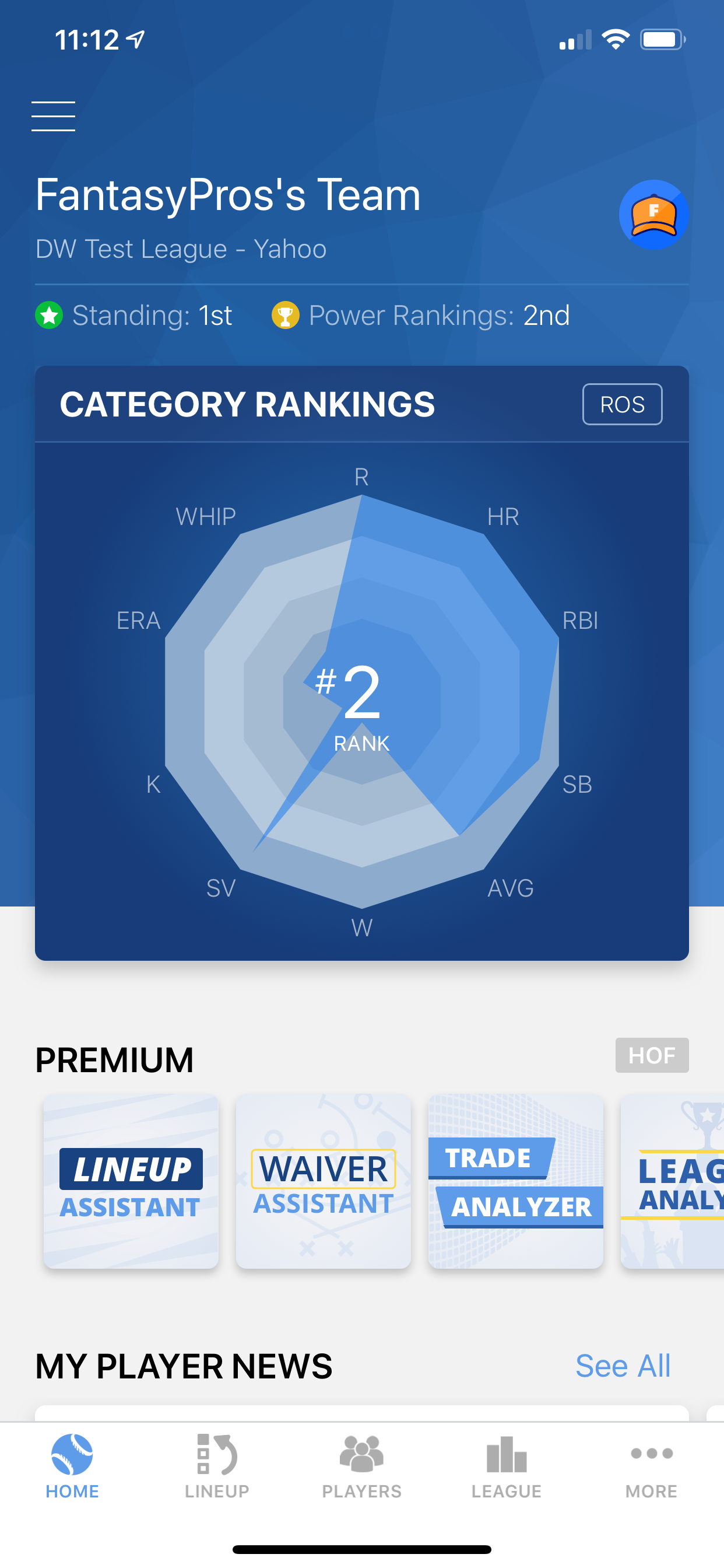 You'll immediately notice that the home screen shows your current league and power rankings, a spider chart with your category strengths and weaknesses, as well as quick access to player news, articles, and podcasts.