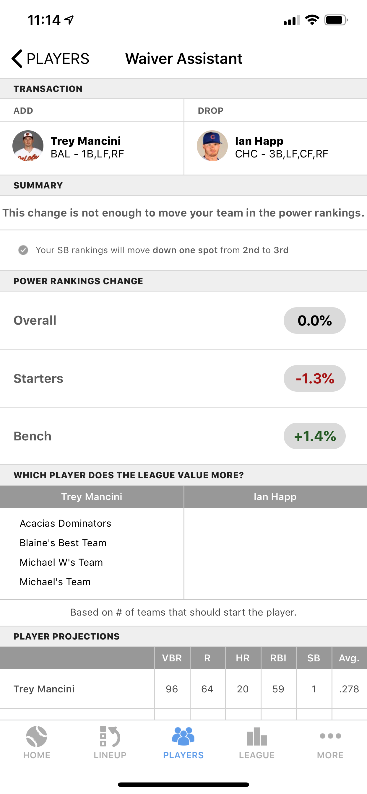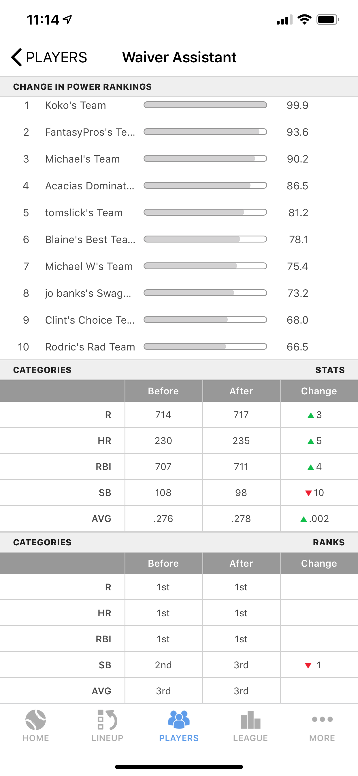 We've tweaked the way we present analysis of our waiver and trade tools. After you select who to add/drop (or trade for), we show you how much of an impact that transaction will have on your standings in our power rankings, reflected by a +/- percentage. We previously displayed a transaction rating, but it was confusing for many, so this should be an easier way to see if things will shake out well for you.