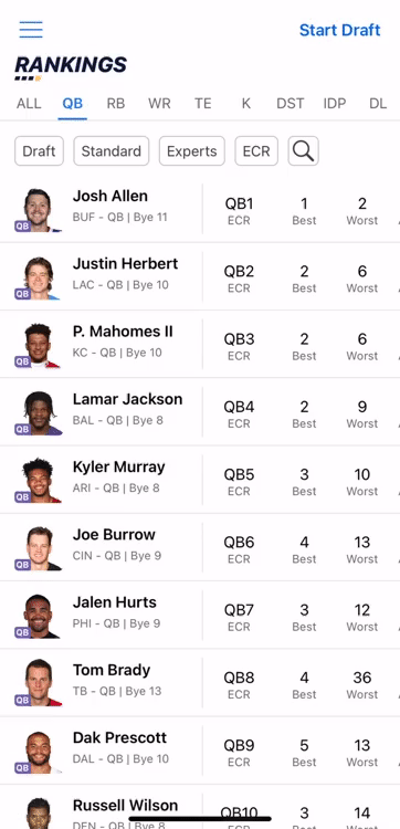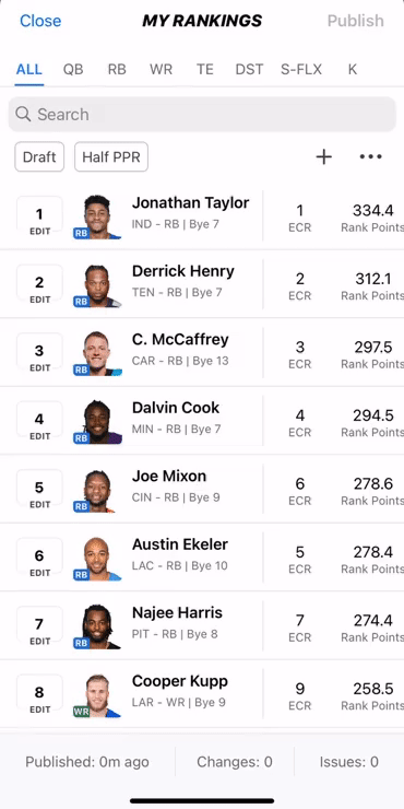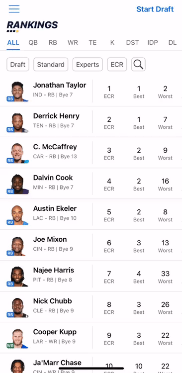The new update to the Fantasy Rankings & Stats app provides the full power of our Expert Consensus Rankings (ECR) in a mobile-sized view. Easily switch between Draft, Dynasty, and Weekly views to reference during your live league draft or for in-season management.