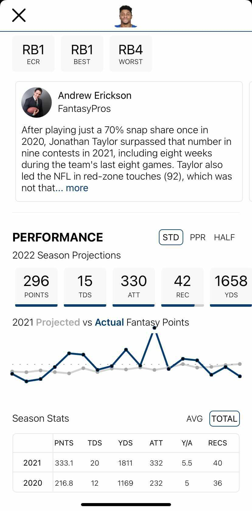 As you navigate the rankings, tap into any player to view their player card which provides you the most up-to-date info on every fantasy-relevant player out there. Catch up on the most recent news and its fantasy impact. See a breakdown of each player's Expert Rankings alongside notes powered by the FantasyPros experts. Check out a glimpse at that player's in-season performance and how that stacks up against their projections, broken out by positional categories.