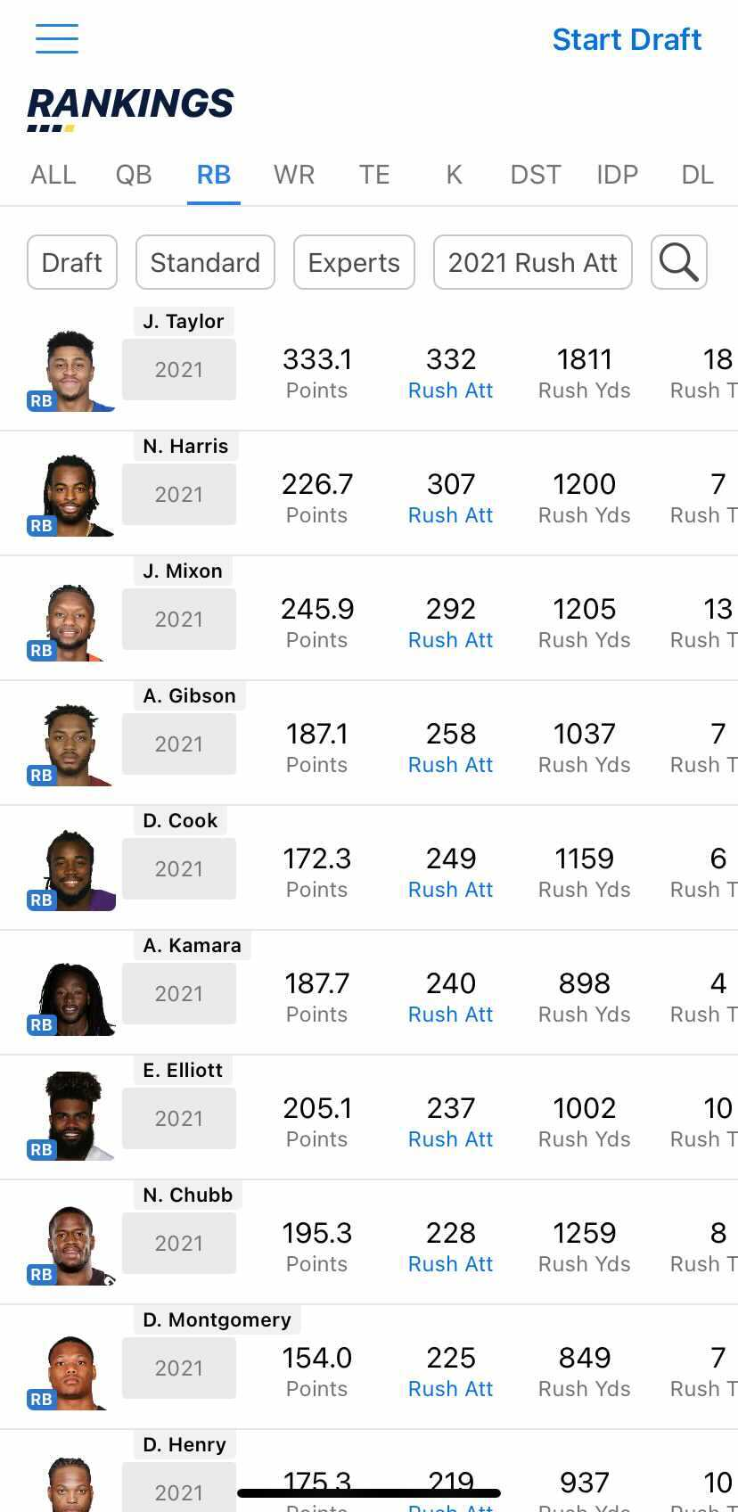 Customize rankings by selecting your favorite or most accurate experts and filter to fit your own league's scoring settings. Easily switch between ECR and ADP to check for the best available or who your opponents might be looking to scoop up with their next pick. You can also order by 2021 stats or 2022 projections, broken out by points categories.