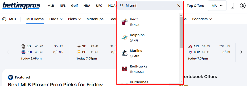 In addition to making it easier to take a deep look at each sport, you can also jump to any Team, Player, User, or Betting Group with our updated Search tool.