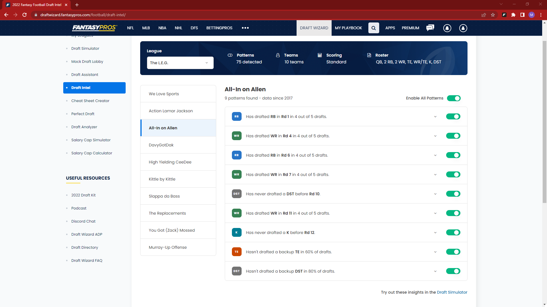 On the Draft Intel page, toggle any (or all) patterns you would like the team's bots to use in a mock draft. Customize each team to test out drafting with different strategies, and drafting against different strategies.
