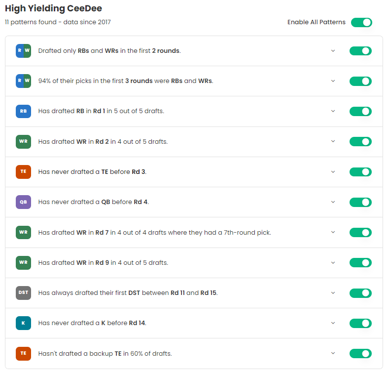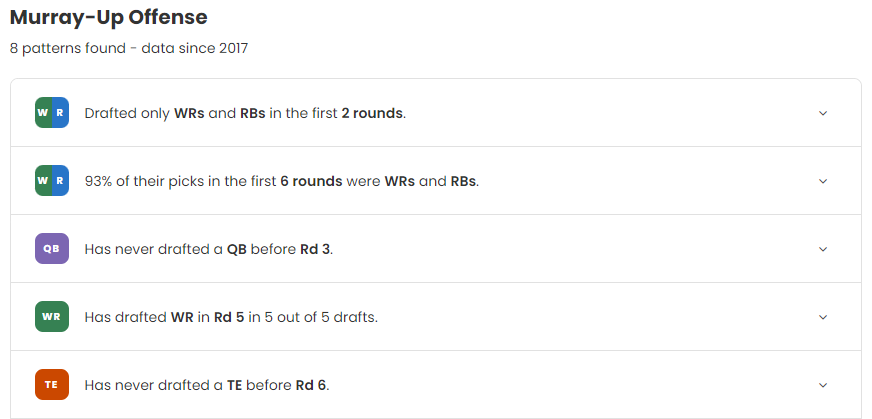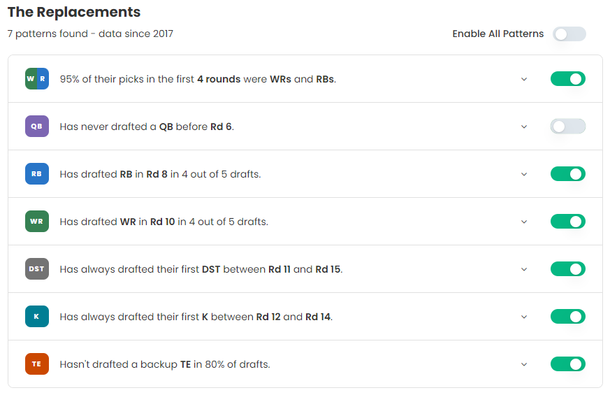 Each insight has a drop-down that shows the relevant draft picks for that pattern, giving you further understanding on what your league mates are aiming for and when.