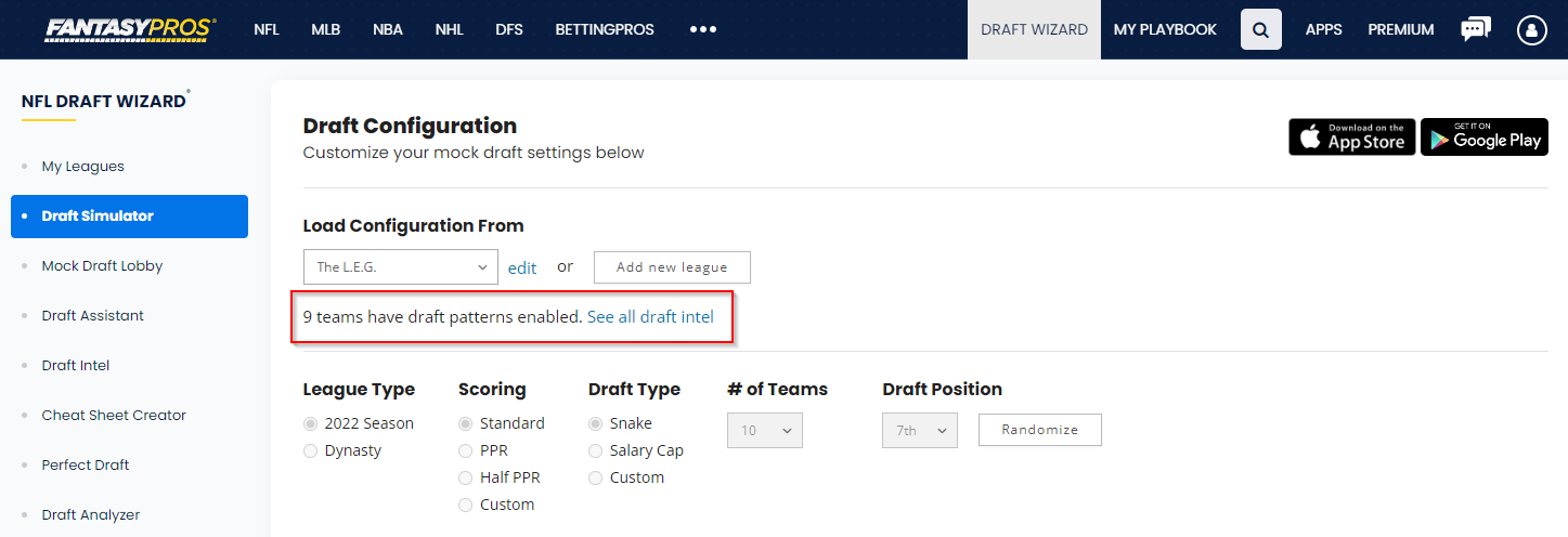 Note: Using Draft Intel patterns in the Mock Draft Simulator requires a premium subscription.