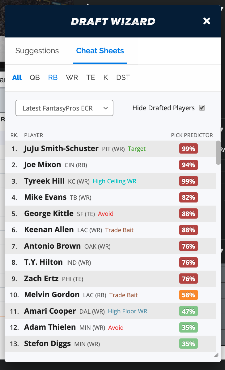 The FantasyPros Chrome Extension also lets you view the Pick Predictor along with our new custom cheat sheet tags. You can also view the new player cards by clicking on the player name in the Suggestions tab.