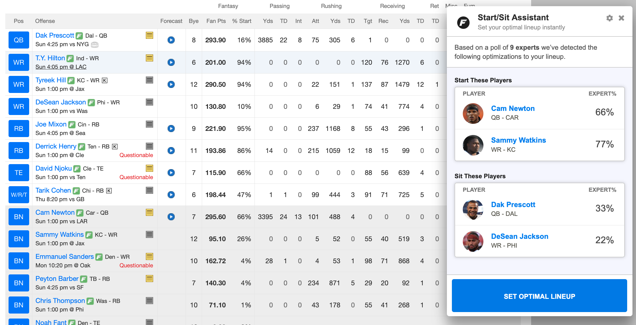 You also get optimal lineup advice on your team screen, with the ability to set the lineups directly from our extension: