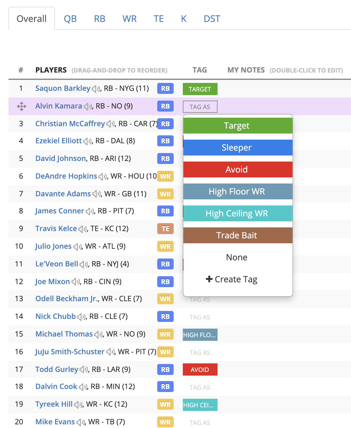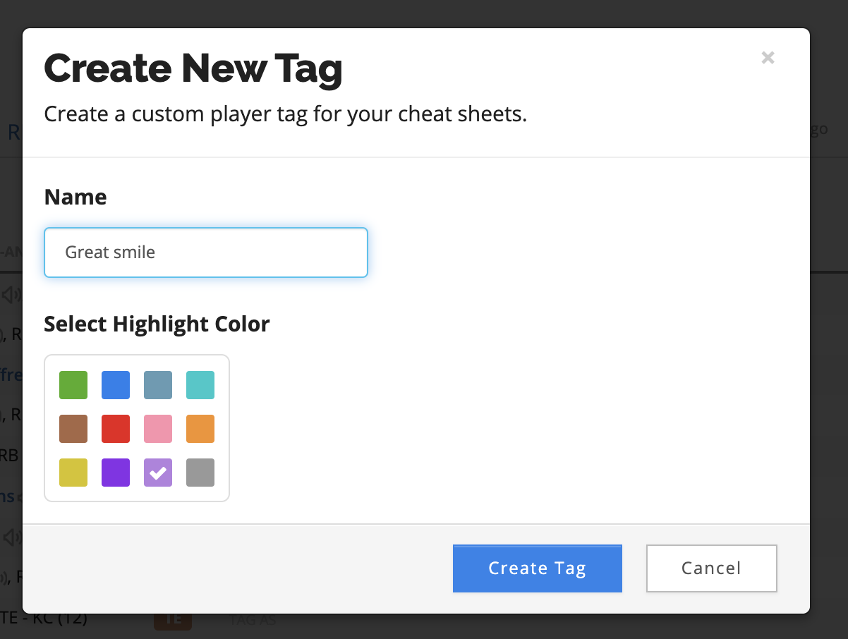 A long requested feature has finally come to life: custom cheat sheet tags. Previously, our Cheat Sheet Creator allowed you to add 3 tags to players: Target, Avoid, and Sleeper. Now, you can create an unlimited number of tags for players, with custom names and tag colors. Additionally, editing a tag now updates that tag across all players.