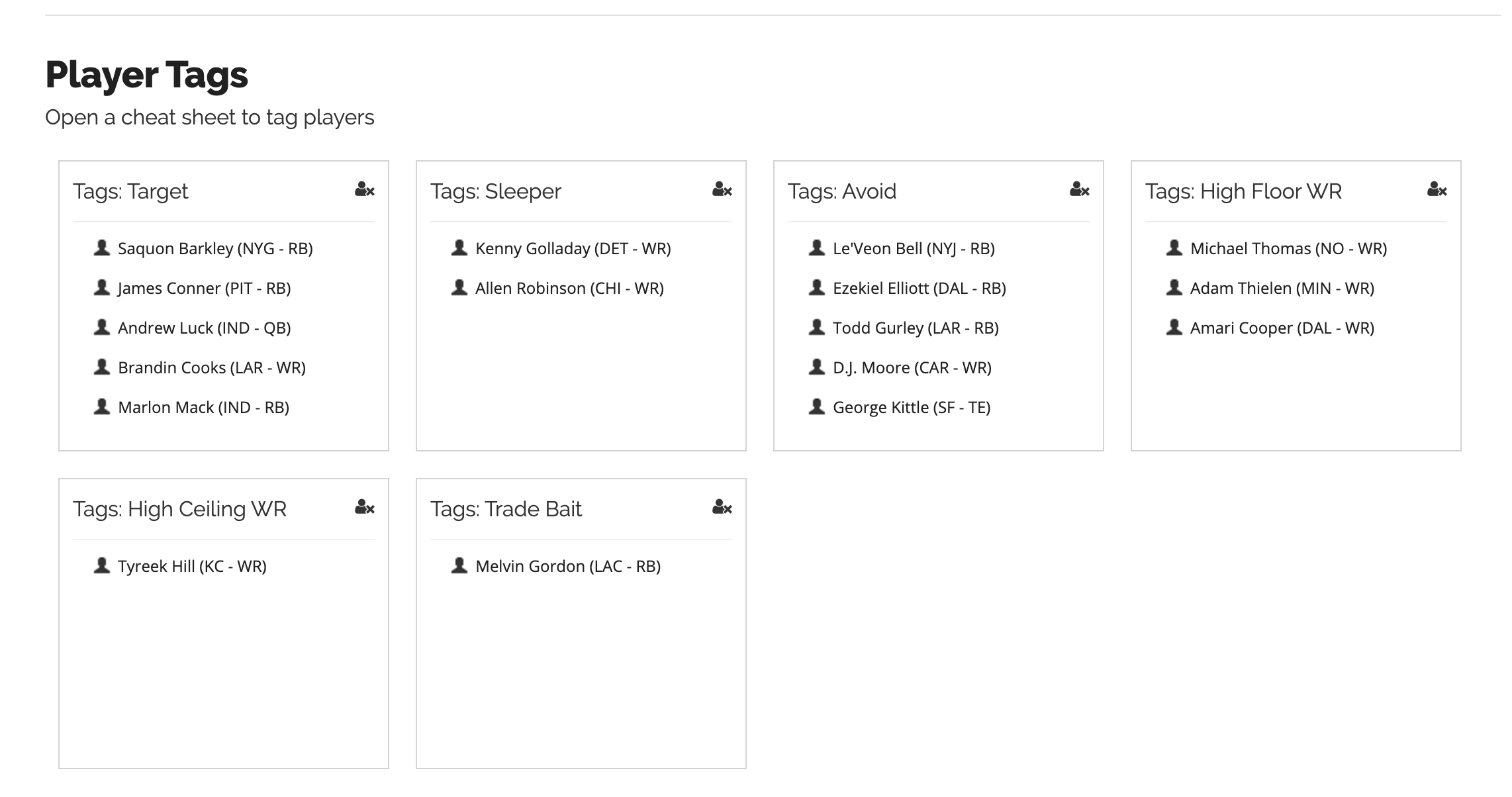Player tags span all of your cheat sheets, so you only need to tag a player once for that to be reflected everywhere else.