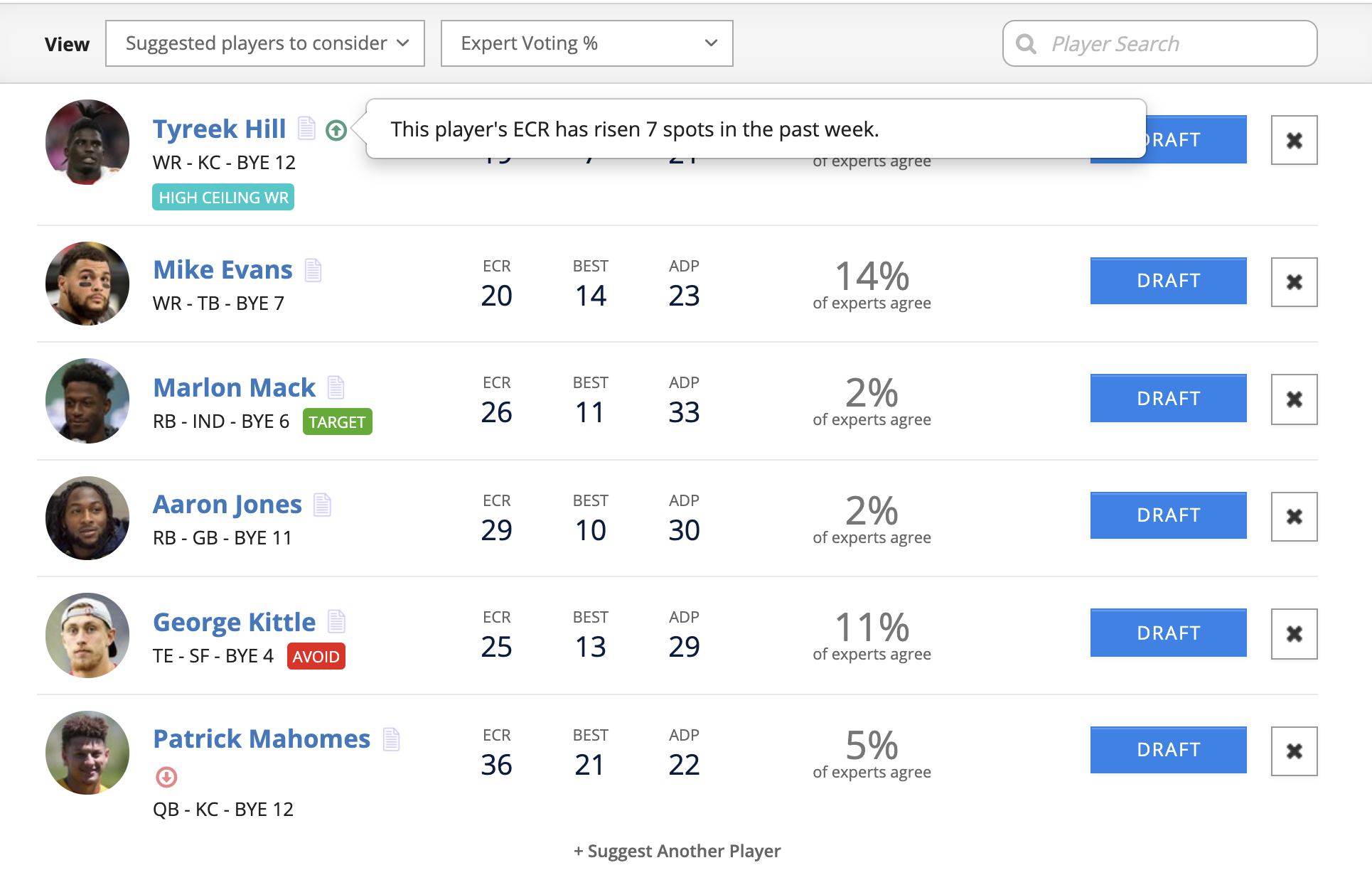 Another addition to the Draft Wizard experience is a new notification for players that we're calling ECR Risers and Fallers. If there's significant change in a player's expert consensus ranking in the past week, you'll see a little green or red arrow next to their name in the Player Suggestion Queue. This way you can identify movement based on breaking news, injuries, suspensions, etc.
