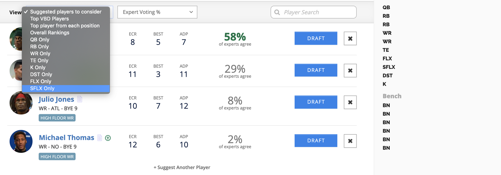 We also added updated player views for Flex and Superflex (i.e. QB/RB/WR/TE) positions. This is available in the "View" filter above the Player Suggestions queue.